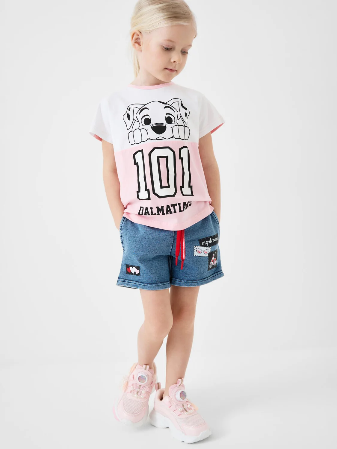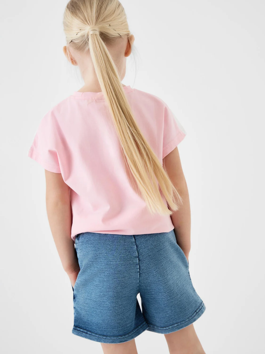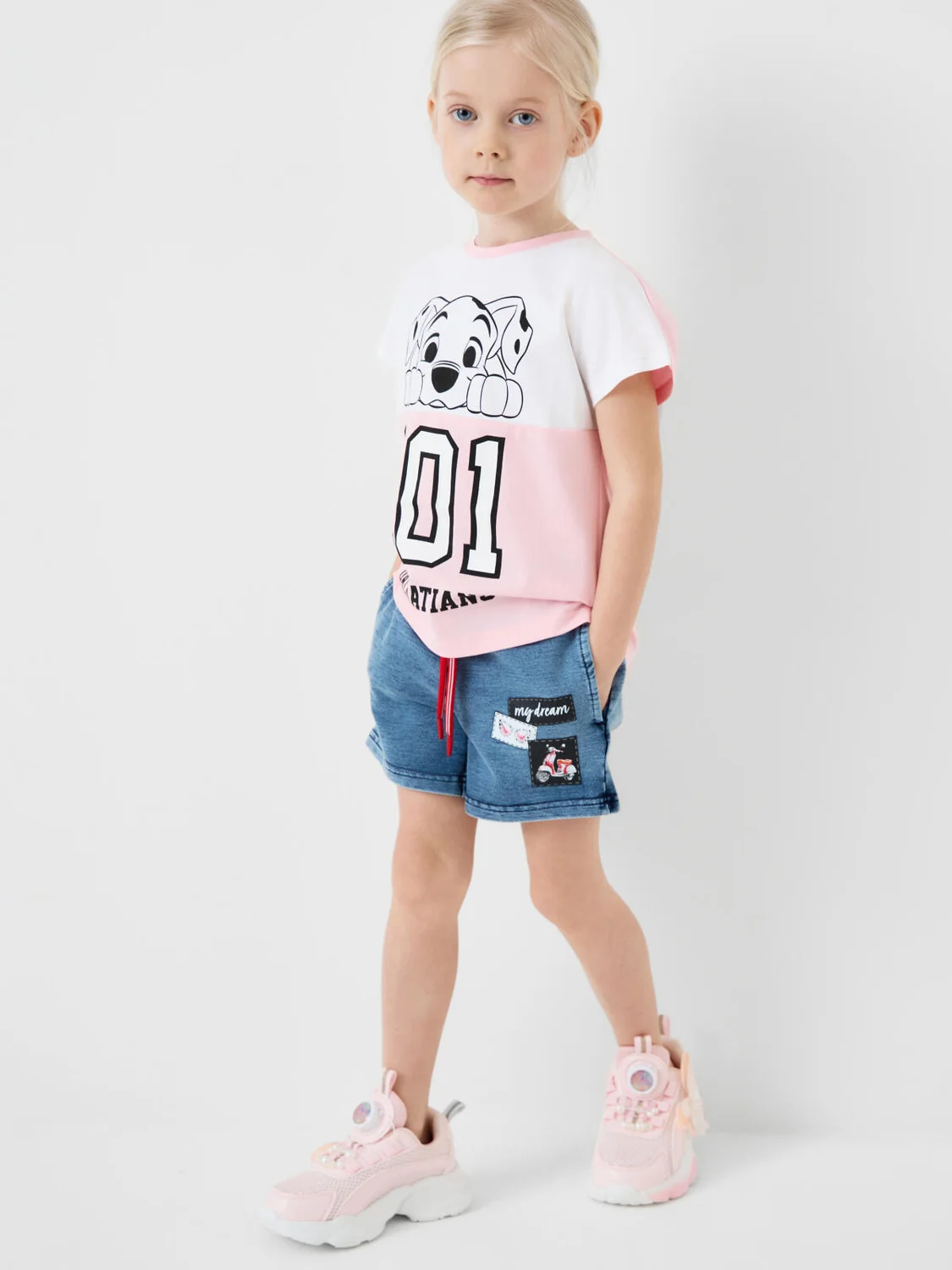 Детские шорты короткие для девочки. Модель свободного кроя. Материал визуально похож на деним, но имеет все качества хлопкового трикотажа. Удобная посадка обеспечивается эластичным поясом со шнуром. Спереди расположены два боковых кармана. Декоративные нашивки.