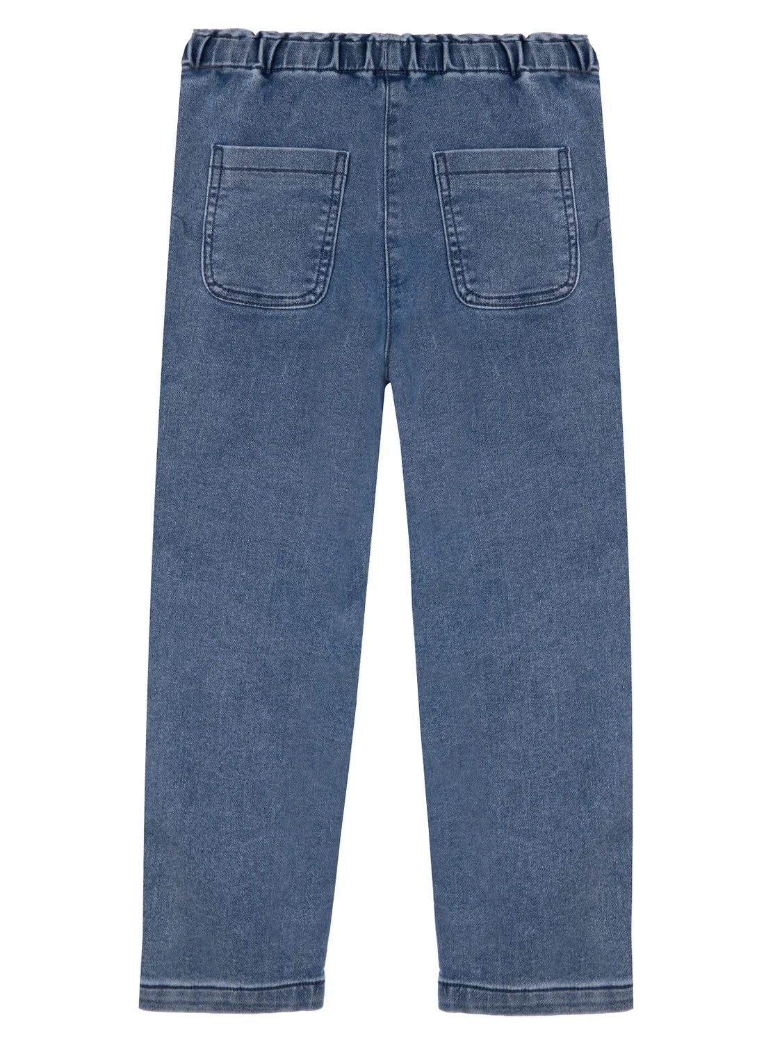 Джинсы из сверхудобного эластичного материала Loop Denim. Loop Denim имеет внешний вид премиальной джинсы, а по тактильным ощущениям мягкий и комфортный, как трикотаж. Посадка regular fit – классический крой со слегка зауженным силуэтом от колена. Комфортная посадка за счет внутренней утяжки. Эластичный пояс с тесьмой позволяет легко надевать джинсы и утягивать до идеальной посадки в зависимости от комплекции ребенка.