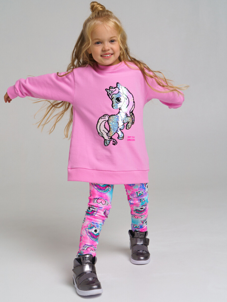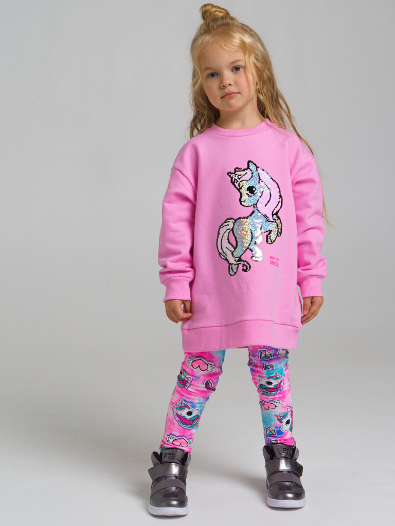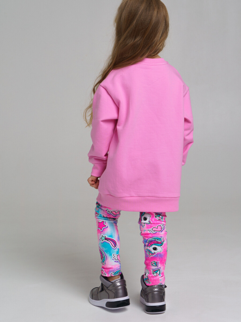 Комплект: свитшот удлиненный, легинсы. Размер изделия на фото - 110, параметры модели (см): рост 104,5, обхват груди-талии-бедер: 53,5-57-53,5. Трикотаж с начесом. Манжеты в рубчик. Толстовка: 60% хлопок, 40% полиэстер. Леггинсы: 60% хлопок, 35% полиэстер, 5% эластан.