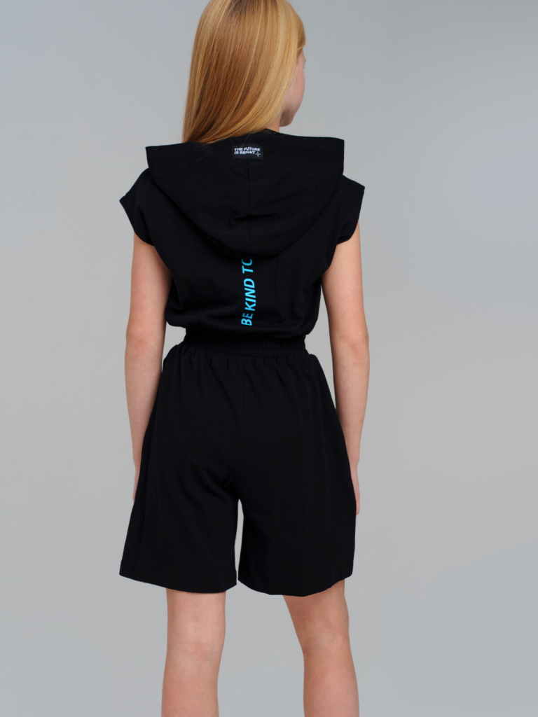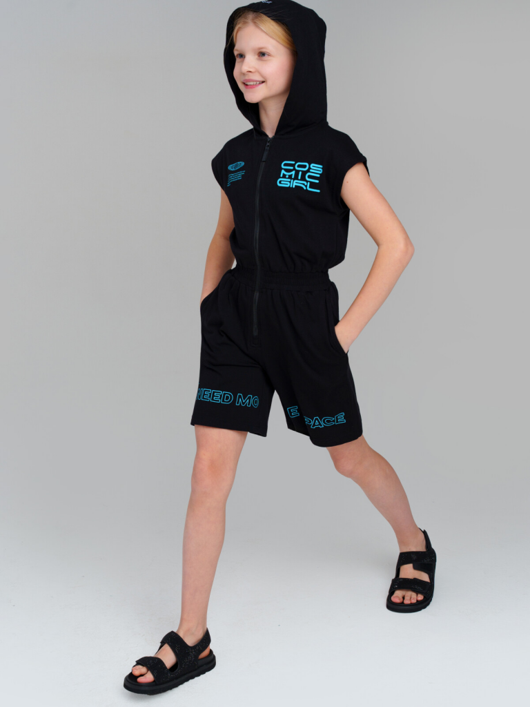 Комбинезон для девочки подростка. Пояс на резинке. Застежка на молнию. Функциональные боковые карманы. Высокое содержание хлопка 95%. Благодаря наличию эластана в составе ткани изделие держит форму и меньше мнется. Модель выполнена из качественного и приятного на ощупь трикотажа.