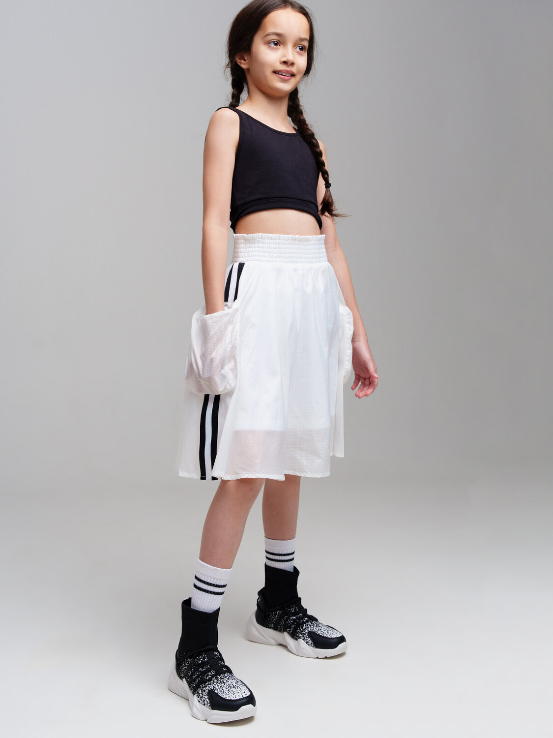 Юбка для девочки подростка. Пояс на резинке. Карманы на молнии. Декор из сетки.