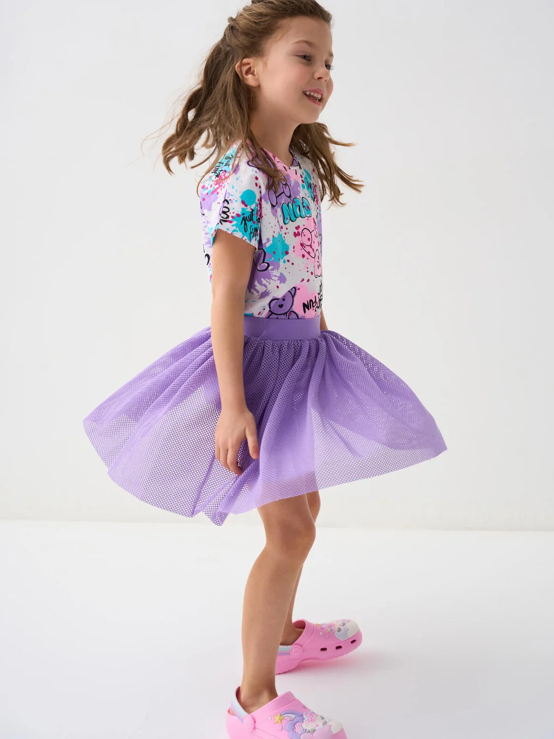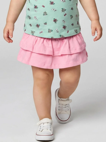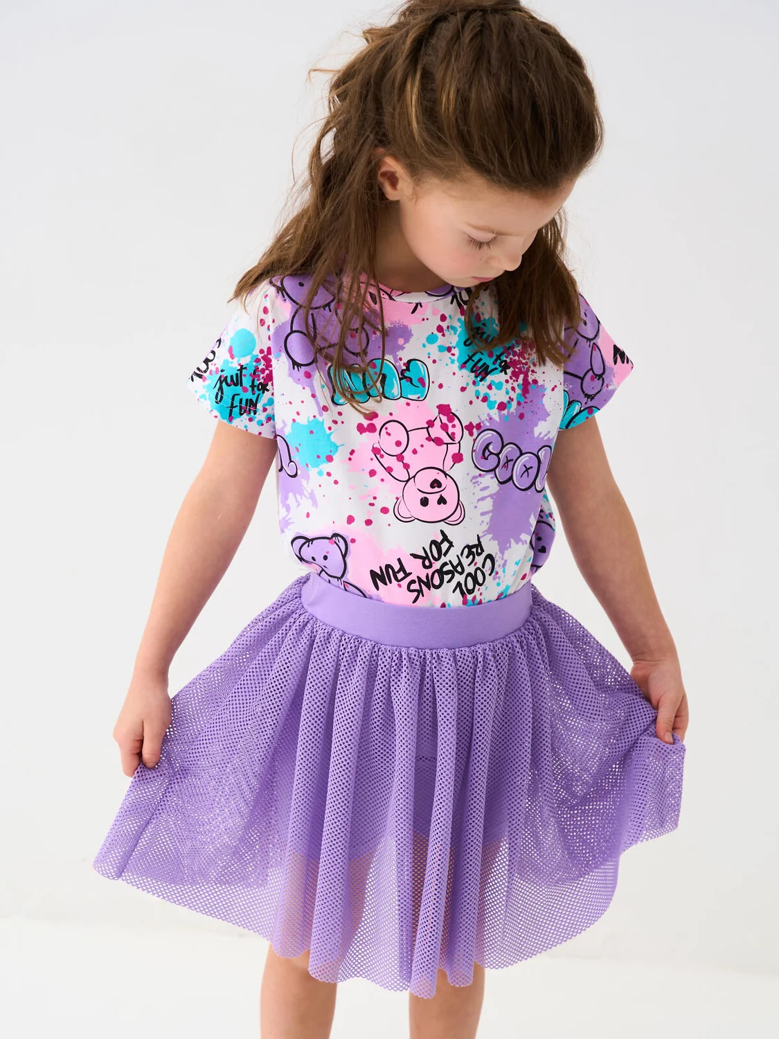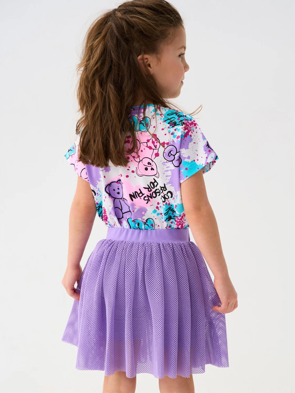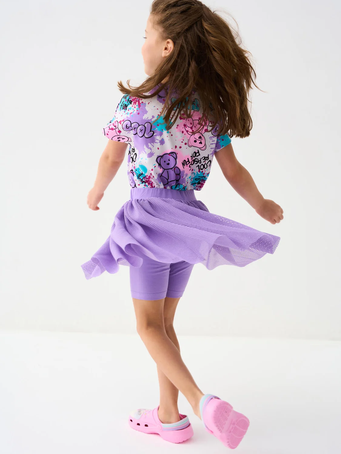 Лёгкая детская трикотажная юбка-шорты для девочки. Верхняя часть из сетки лилового цвета, а под ней скрыты удобные внутренние шорты. Пояс на мягкой резинке.