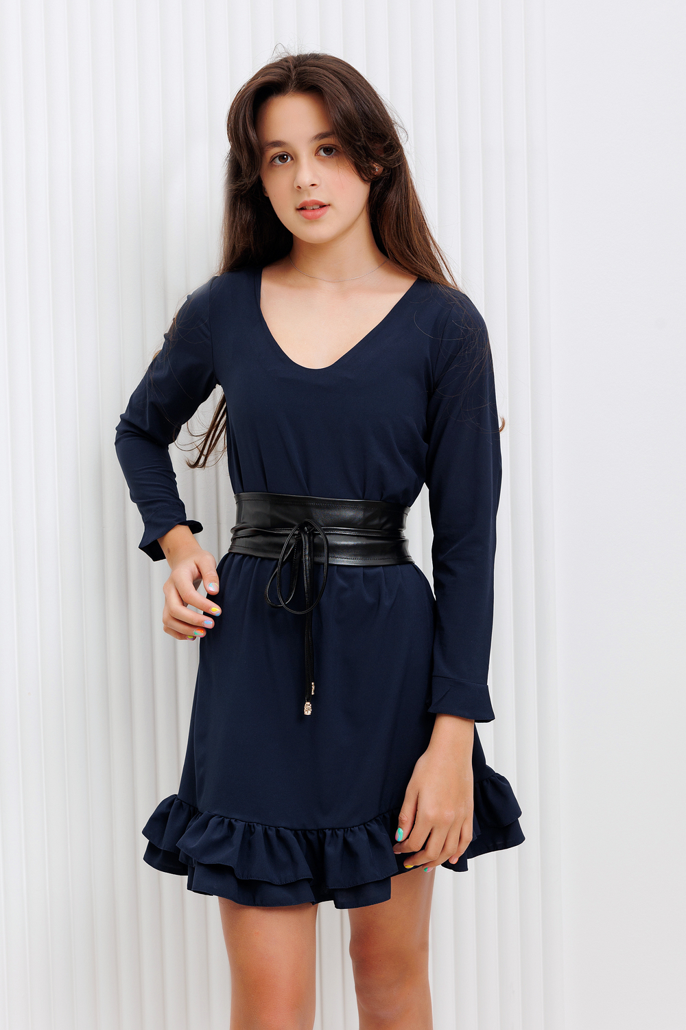 Платье для девочки Raposa темно-синего оттенка отлично подойдет для школьного мероприятия, такого как выпускной или последний звонок. Оно сочетает в себе требования школьной формы и при этом имеет стильный и элегантный вид. Длинный рукав оформленный воланом, оригинальный подол. Два пояса в комплекте позволят изменить общий образ и подчеркнуть талию. Учитывайте индивидуальные предпочтения и особенности фигуры, чтобы выбрать идеальное повседневное платье для девочки. Комплект: платье, пояс (ниагара), пояс (экокожа).