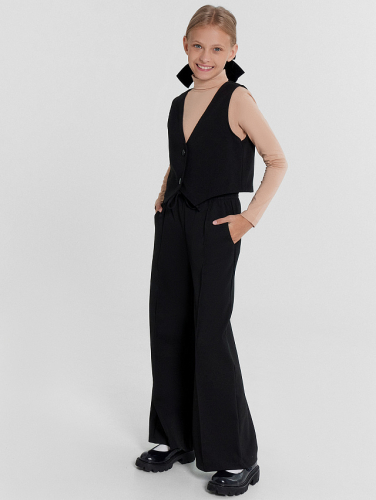 Брюки свободного силуэта расклешенные к низу. Посадка высокая. Пояс цельнокроеный с эластичной тесьмой и шнуром из основного полотна внутри. По поясу выполнены 3 декоративные строчки. На передних половинках выполнена декоративная отстрочка по центру и обработаны карманы с фигурным входом от боковых швов. Низ изделия обработан на 2-х игольной плоскошовной машине швом в подгибку.