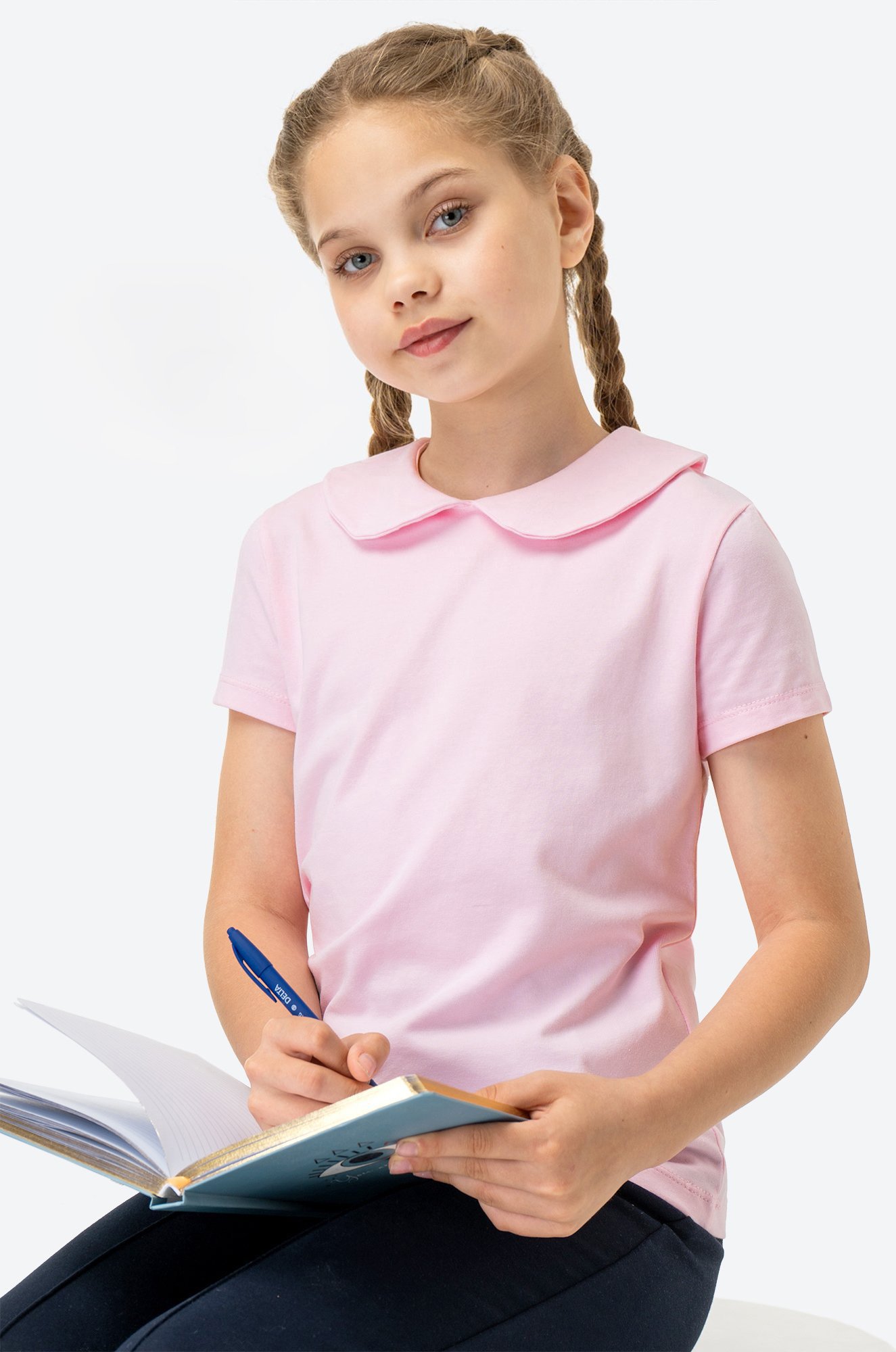 Нарядно каждый день! Летняя блузка для..показать девочки и девочки-подростка выполнена из хлопкового трикотажа кулирная гладь. Школьная блузка с коротким рукавом декорирована круглым отложным воротничком и представлена в розовом цвете. Для удобства одевания предусмотрена застежка-капелька по спинке.