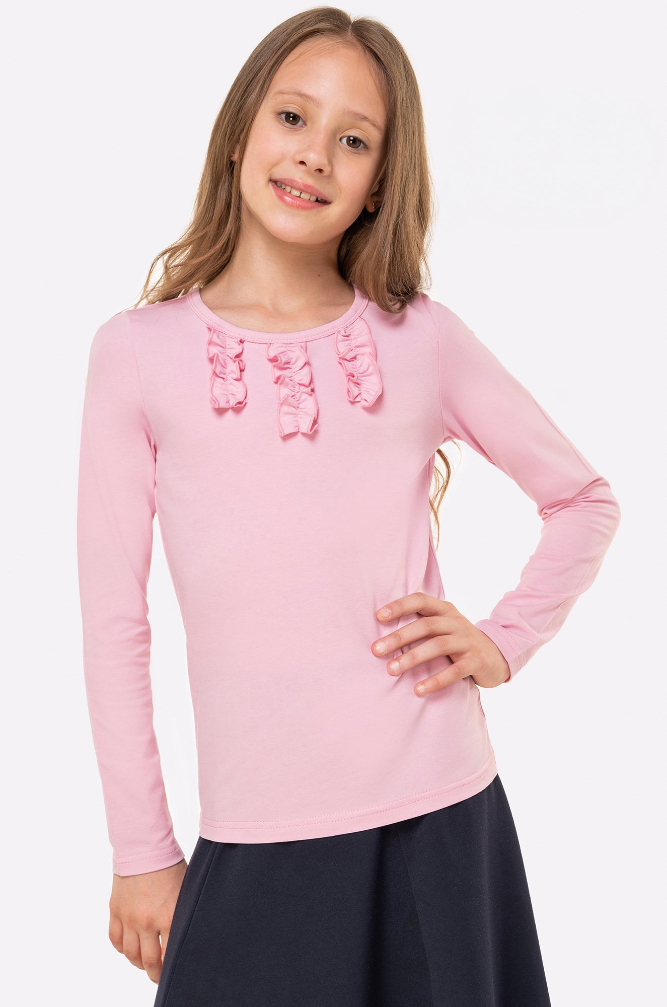 Детский..показать лонгслив из легкого трикотажа станет идеальным дополнением к школьной форме для девочек и девочек-подростков. Аккуратные рюши, длинный рукав и базовый розовый цвет – важные детали, которые делают лонг для детей красивым и опрятным.