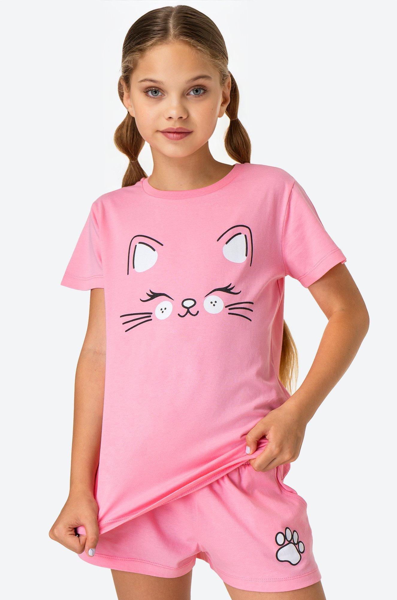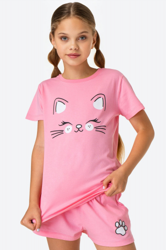 — пижамный комплект для девочки состоит из футболки с коротким рукавом и свободных шорт на мягкой резинке;