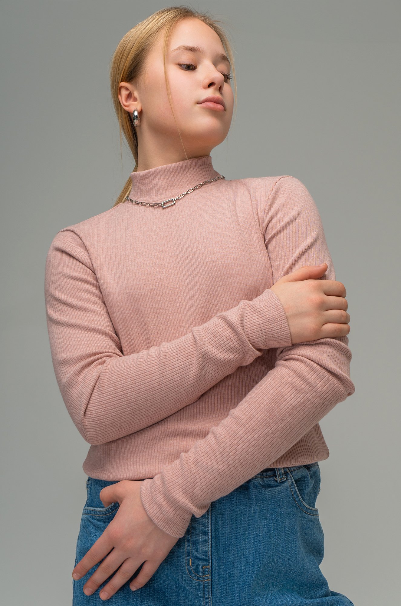 Подростковый лонг с горлом — универсальное решение на каждый день. Трикотажный бадлон пудрового оттенка подойдет для школы и для прогулок, станет стильной базой на весну и осень.