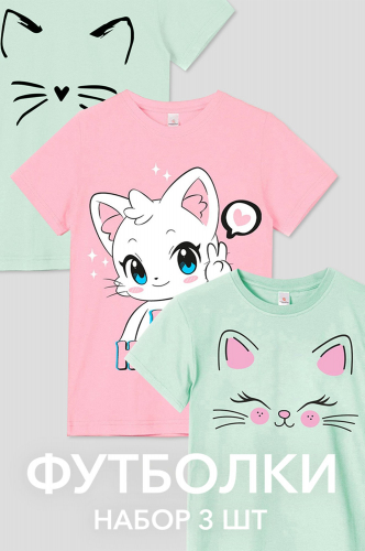 Набор детских футболок для девочек 3 штуки выполнен из дышащего 100% хлопка – отличное решение для жарких дней. Прямой крой, мягкая горловина и аккуратные плоские швы – эти футболки для детей будут комфортны в любой ситуации! Летние футболки представлены в пастельных цветах и украшены рисунками Котики и надписью.