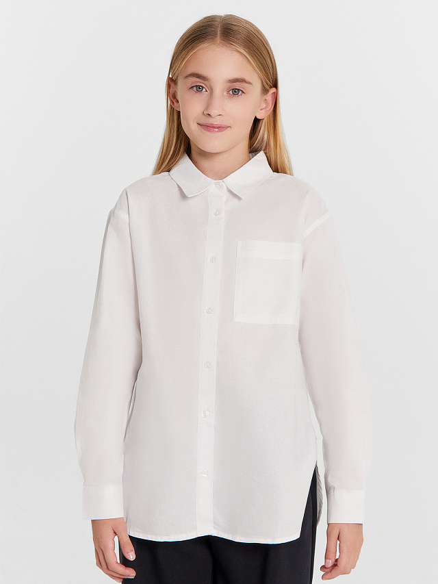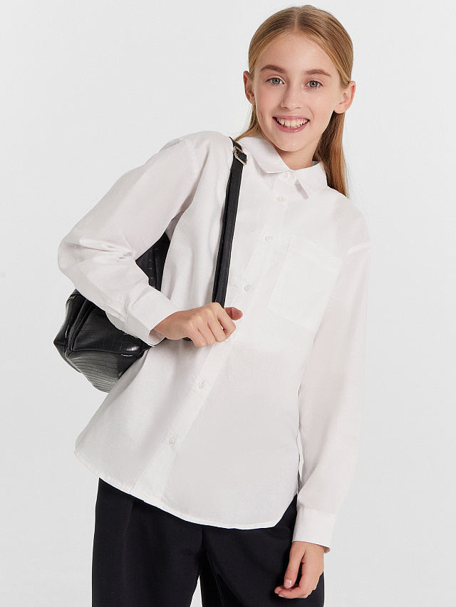Однотонная рубашка для девочки выполнена из высококачественного хлопка. Материал натуральный, хорошо пропускает воздух, слегка тянется и не сковывает движения. Модель с удобной центральной застежкой на пуговицы. На детали переда - накладной карман. Спинка с отрезной кокеткой, по центру заложена встречная складка. Горловина круглой формы, в горловину втачан воротник с цельнокроеной стойкой. По воротнику проложена отделочная строчка. Рукав длинный, широкий с односторонними складками и отрезными манжетами из основного полотна. Низ изделия - фигурный. К рубашке в комплект можно подобрать интересный и красивый низ, с которым можно создать модный и выразительный образ. Такой вариант отлично подойдет в школу на занятия. Представлена в различных цветах. Отличный повседневный вариант от Mark Formelle!