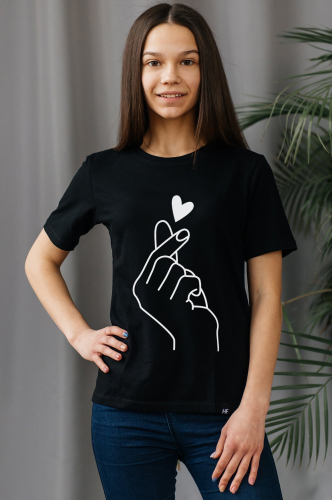 Детская футболка для девочки и девочки-подростка выполнена из 100% хлопка и представлена в черном цвете. Летняя модель украшена рисунком Рука с сердечком и станет любимым вариантом на каждый день.