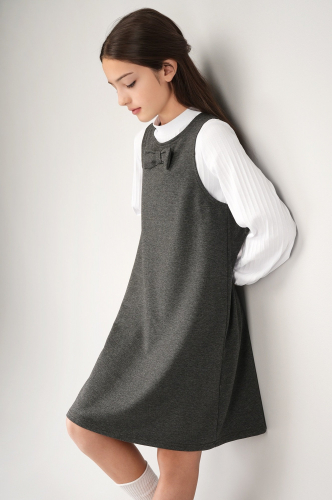 Детский сарафан для девочек и девочек-подростков выполнен из мягкого футера двухнитки. Комфортный силуэт трапеция, длина выше колена, милый бантик – этот серый сарафан для детей точно станет любимым элементом школьной формы и покорит сердца окружающих!