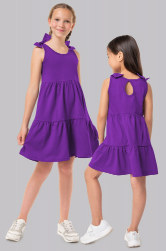 Благодаря свободному крою сарафан из трикотажа не стесняет движений. Аккуратный бантик делает образ сдержанным и опрятным.