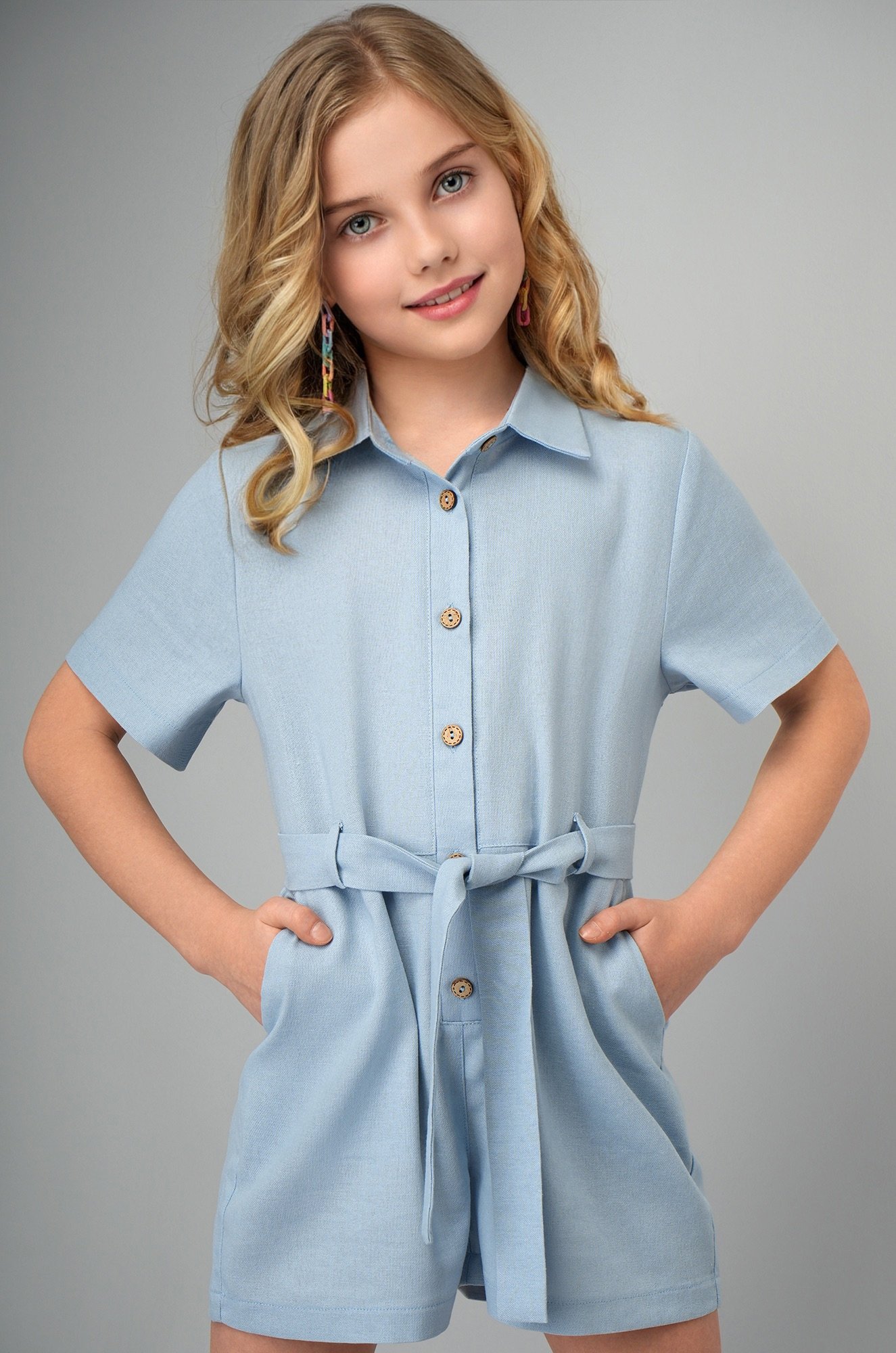Короткий комбинезон для девочки и девочки-подростка идеален для прогулок с подружками и важных событий в садике. Однотонный серо-голубой цвет смотрится особенно свежо и стильно, а длина мини добавляет игривого настроения.
