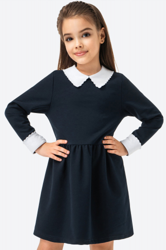 Детское платье с белым воротником и манжетами – идеал школьной формы! Платье для девочки выполнено из хлопкового трикотажа. Линия талии присборена, на спинке предусмотрена застежка-капелька на пуговице.
