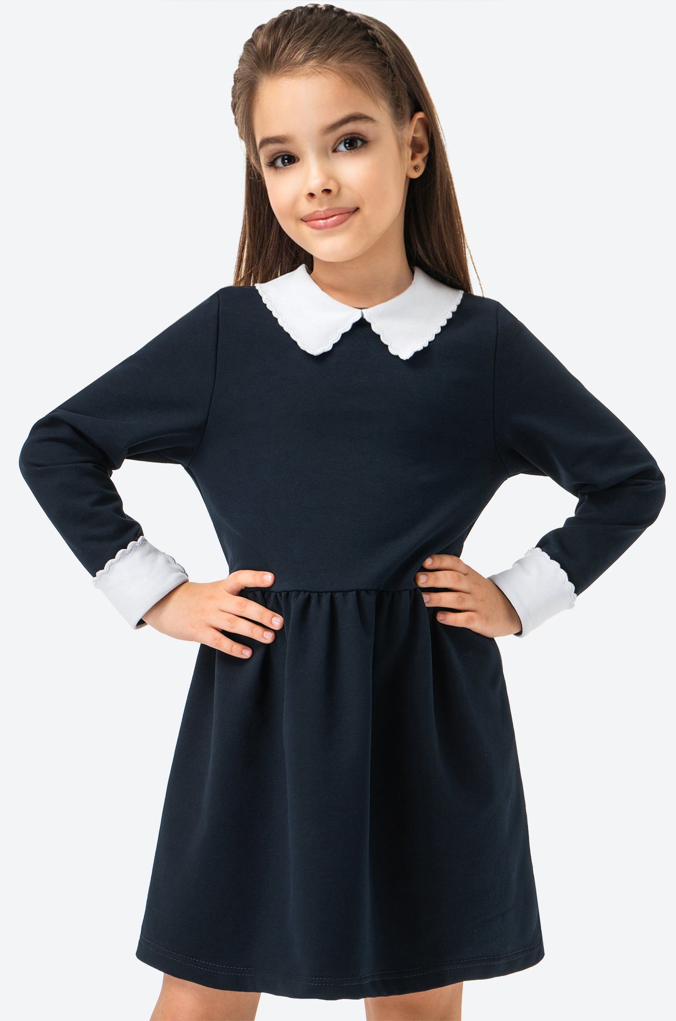 Добавление полиэстера и лайкры в состав делает трикотажную ткань более прочной, она не теряет форму даже после многочисленных стирок. Контрастный воротник синего платья для школы разбавит любой классический образ.