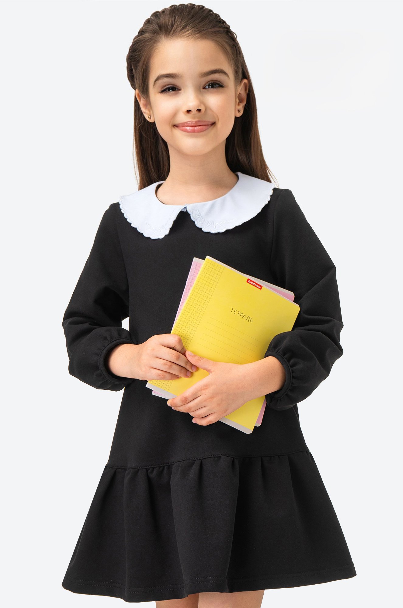Школьное платье, которое вдохновляет на пятерки! Детское платье для девочек выполнено из мягкого футера двухнитки. Комфортный силуэт трапеция и объемные рукава делают черное платье для детей легким и воздушным, а контрастный воротник с аккуратной вышивкой добавляет образу нотку строгости. Нарядное платье станет любимым элементом школьной формы и точно покорит сердца окружающих!
