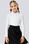 Элегантное школьное поло для девочки – баланс классики и расслабленности! Белая блузка выполнена из хлопкового трикотажа. Стильные детали кроя: отложной воротник, короткая планка на пуговицах, рукава 3/4.