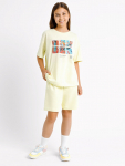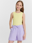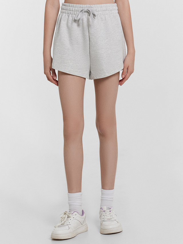 Шорты для девочек. Шорты укороченные, с высокой посадкой. Пояс цельнокроеный с эластичной тесьмой внутри. Снаружи пробиты петли и втянут шнур 8PXС-2. В боковых швах кант из трикотажного кулирного полотна. Нижние срезы шорт обработаны швом в подгибку.