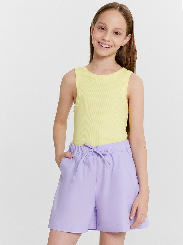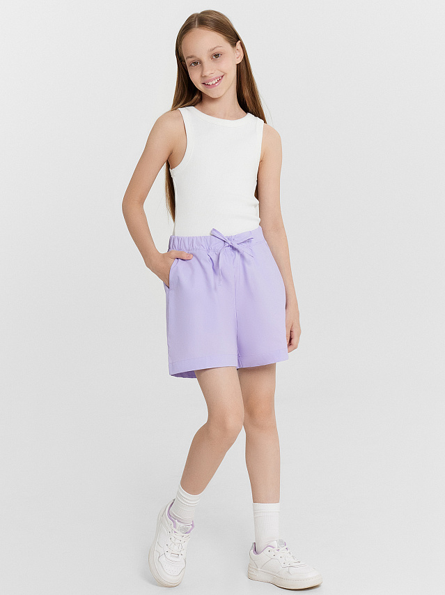 Шорты для девочек свободного силуэта из ткани. На детали переда карманы с отрезным бочком. Пояс отрезной с эластичной тесьмой внутри, на поясе пробиты петли, вставлен шнур из основного полотна. Шов стачивания пояса распошит. Шорты немного расширяются к низу. Длина выше колена.