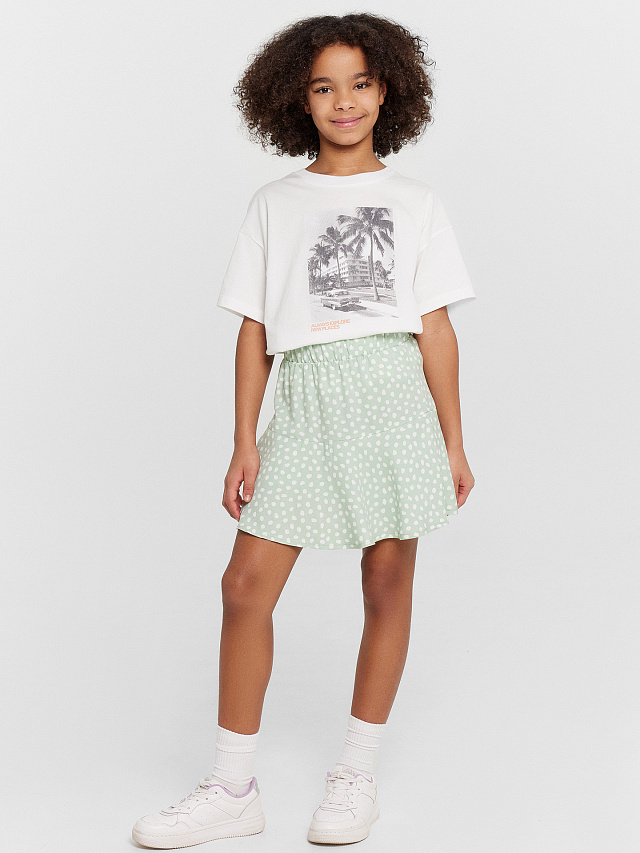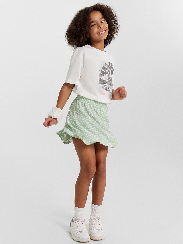 Шорты-юбка для девочек идеально подходит для создания стильных и разнообразных образов юных модниц. Модель отличается высокой посадкой и эластичным поясом, что обеспечивает комфортную и удобную посадку. Крой немного расширяется к низу, а длина изделия выше колена, что придает ему элегантный и современный вид. Нижний край шорт обработан швом в подгибку с закрытым срезом, что добавляет аккуратности и долговечности. Модель выполнена из нежной струящейся вискозы, которая обеспечивает легкость и приятные ощущения при носке.