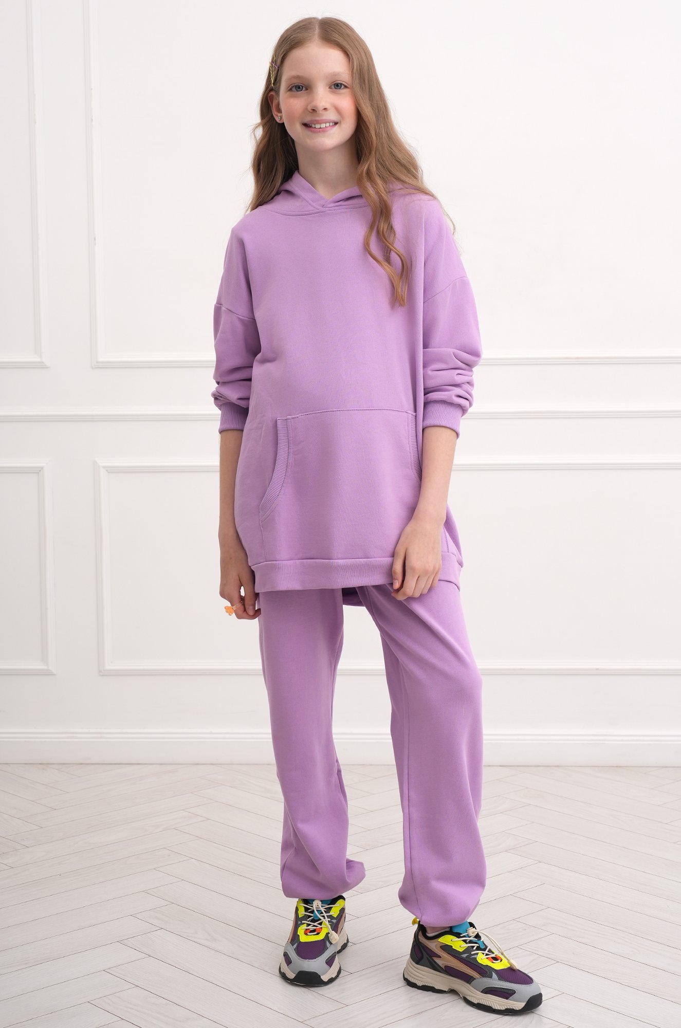 Сиреневый спортивный костюм с брюками — воплощение нежности и свободы для юных школьниц! Романтичный оттенок подчеркивает индивидуальность, а удобная толстовка с капюшоном на шнурке и уютный карман-кенгуру готовы к любым приключениям. Брюки джоггеры на манжетах с регулируемым поясом придают полную свободу движениям.