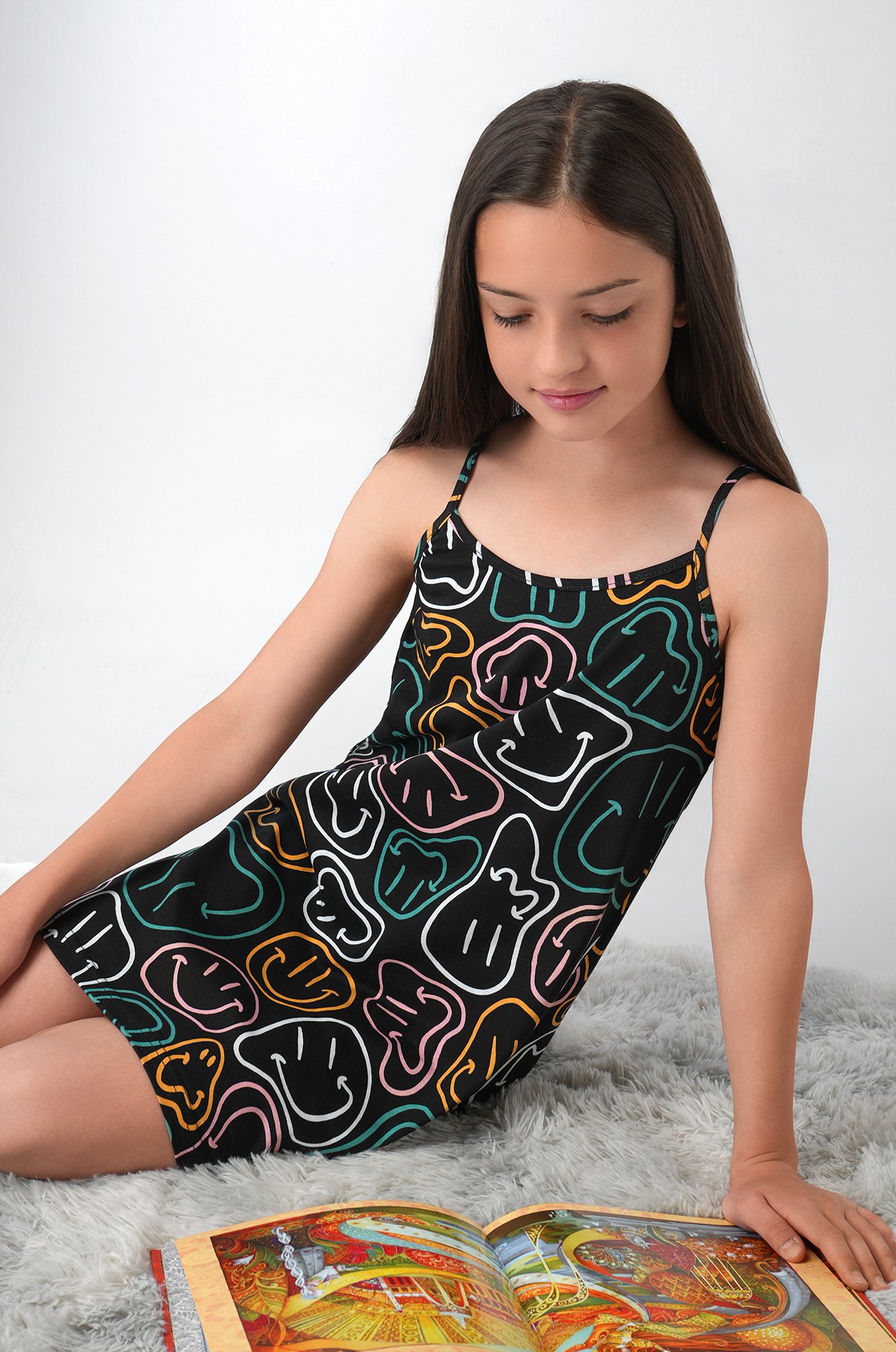 Хлопковая сорочка для девочки с забавным принтом Смайлы подарит уют и хорошее настроение. Легкая ночнушка А-силуэта идеально подойдёт для комфортного сна.