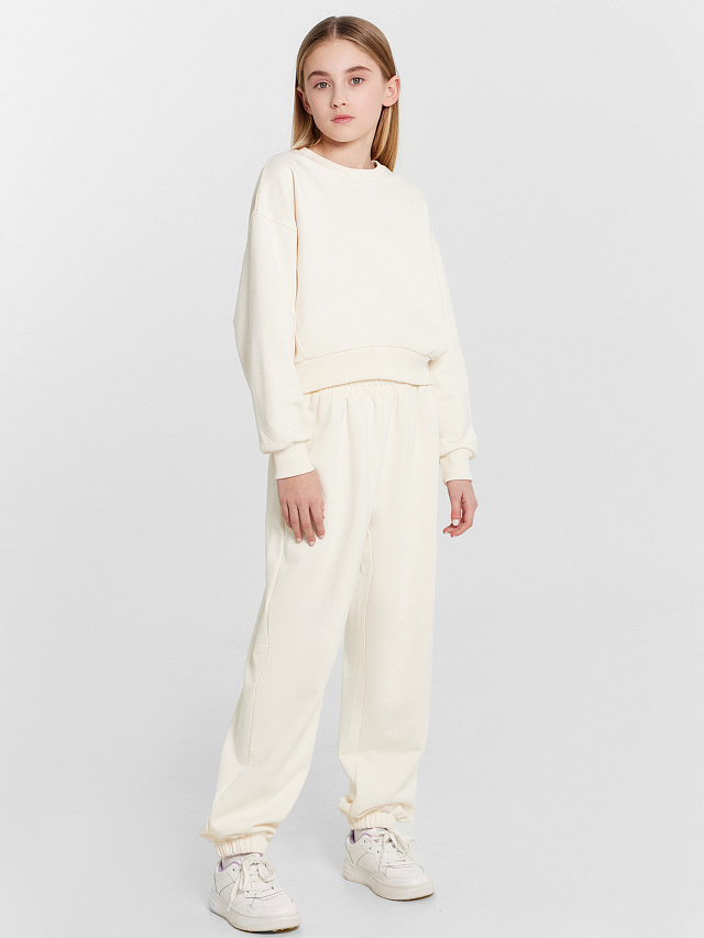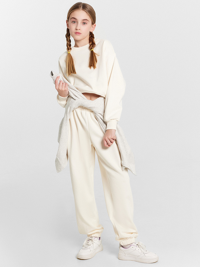 Посадка средняя. Пояс отрезной из основного полотна с эластичной тесьмой внутри. По поясу идут две декоративные строчки. Боковые швы немного смещены вперед. По низу брюк застрочена внутрь эластичная тесьма.
