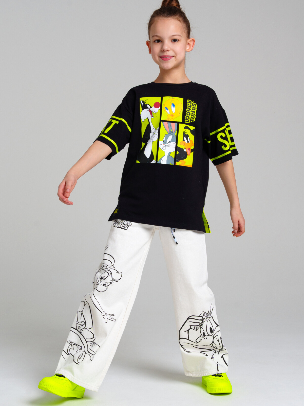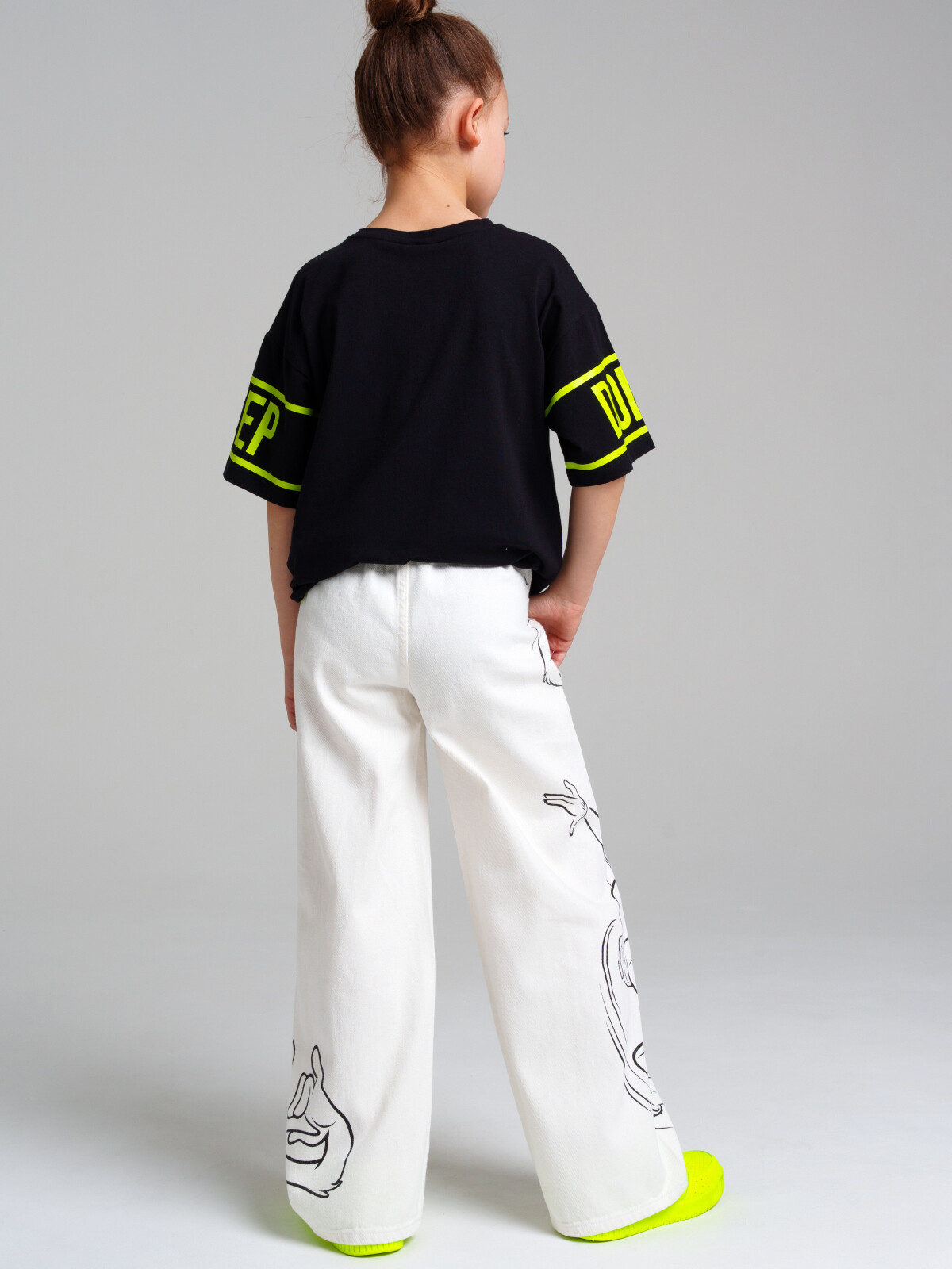 Джинсы для девочки. Эластичный пояс со шнурком. Крой Wide leg - это свободная посадка и расклёшенные от бедра штанины. Высокая посадка. 100% хлопок