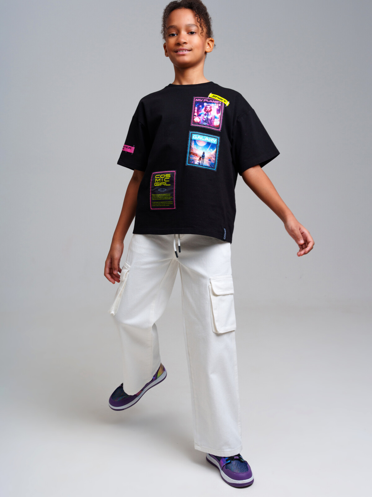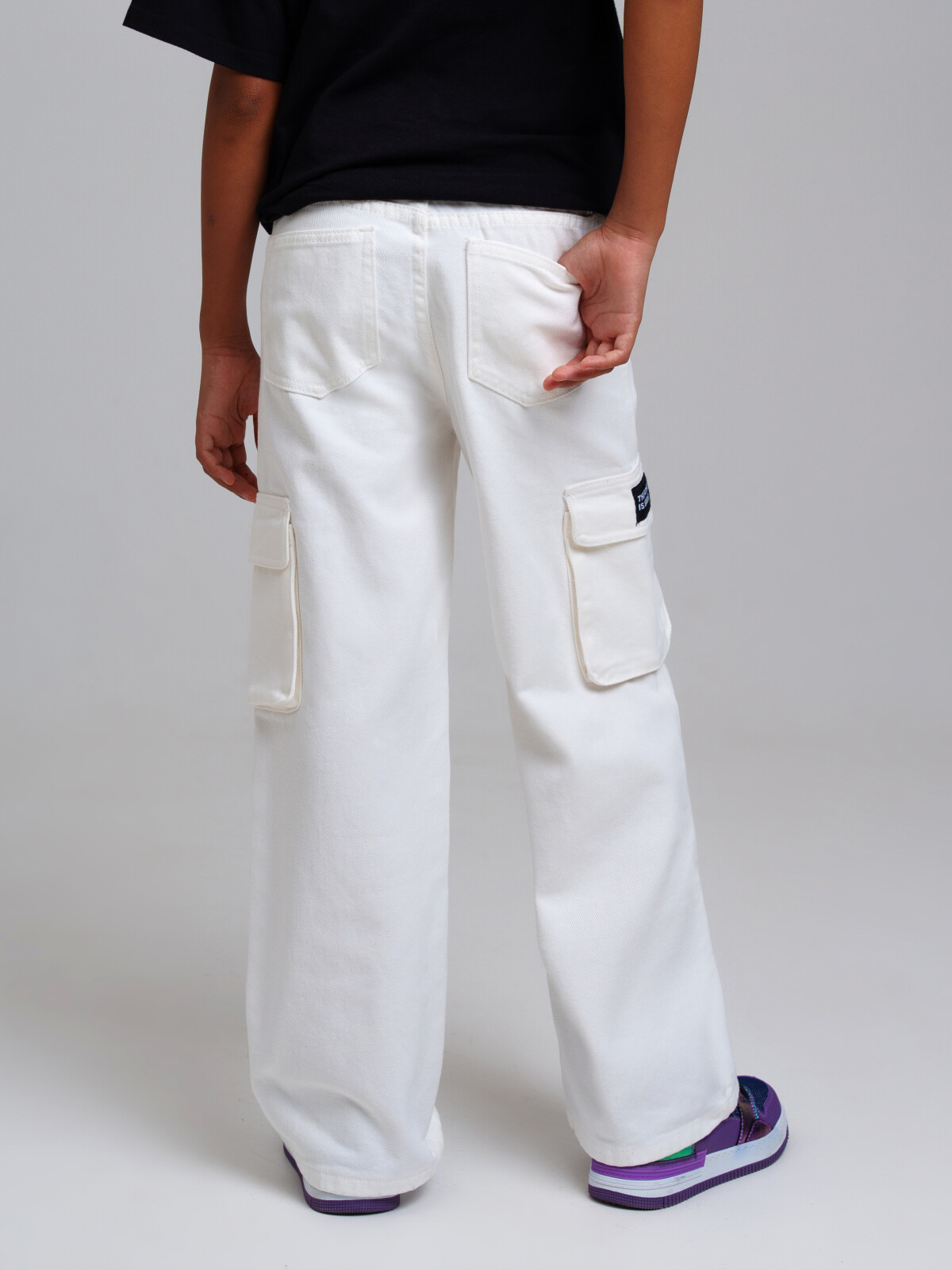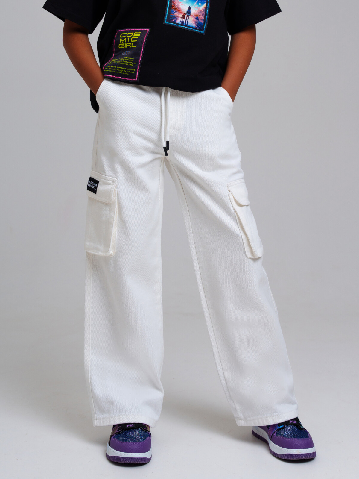 Джинсы для девочки подростка. WIDE LEG - свободная посадка и расклёшенные от бедра штанины. Высокая посадка. Джинсы на резинке со шнурком. Накладные карго-карманы. Модель выполнена из качественного и плотного текстиля. 100% хлопок