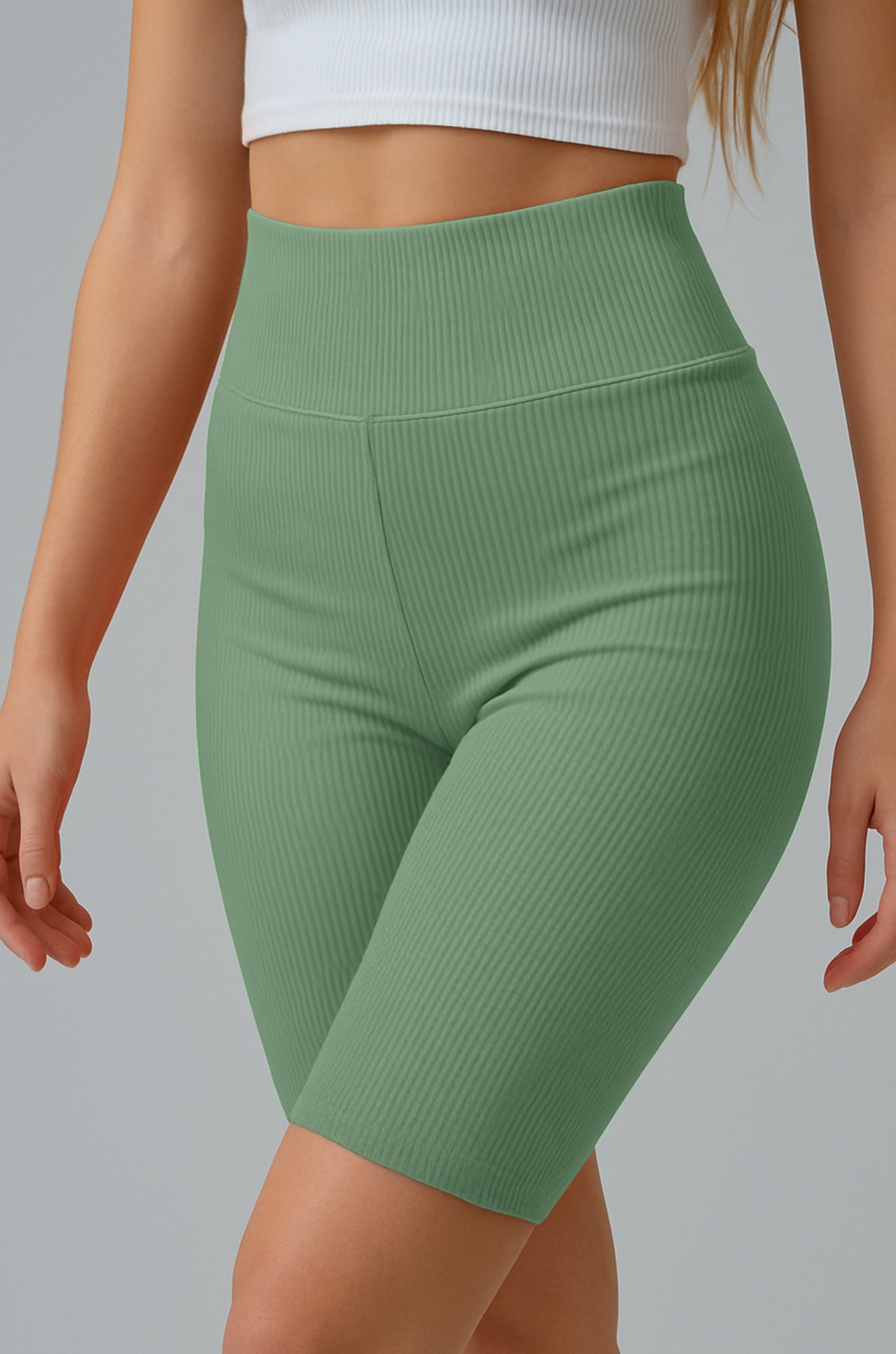 Широкая эластичная резинка нежно прилегает и не сдавливает живот. Благодаря облегающему крою спортивные велосипедки в рубчик повторяют каждое движение тела.
