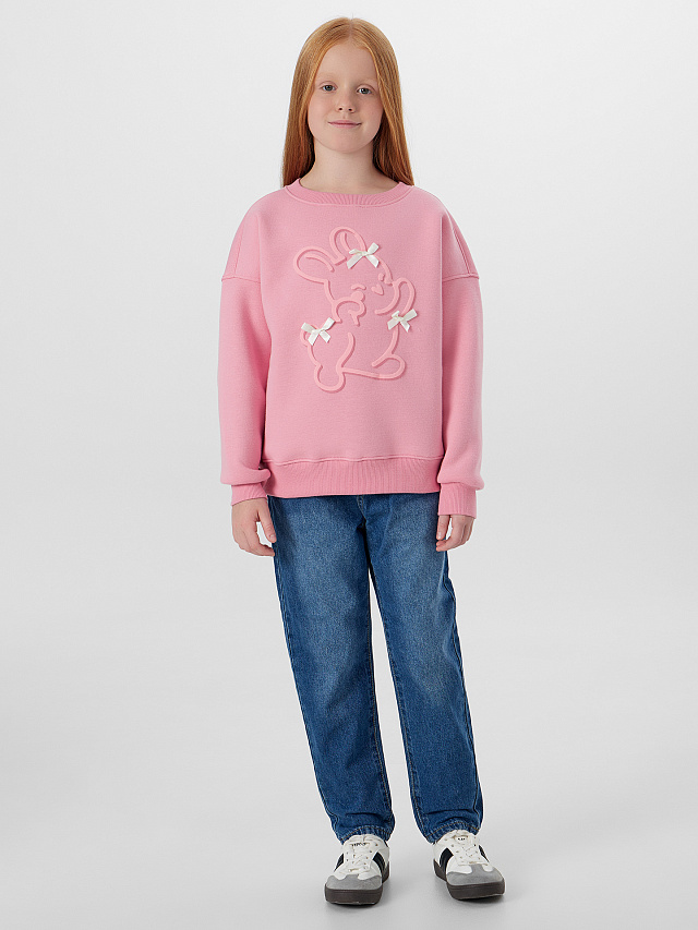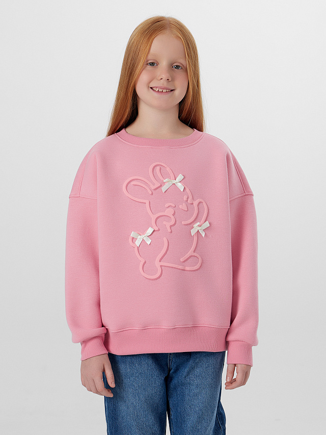 Розовый свитшот для девочек с милым принтом зайчика — уютная и стильная модель для повседневной носки. Свободный крой со спущенной линией плеча и смещенным плечевым швом обеспечивает комфорт и свободу движений, позволяя активно играть и двигаться без ограничений.