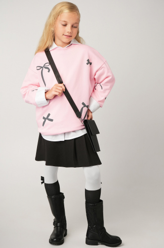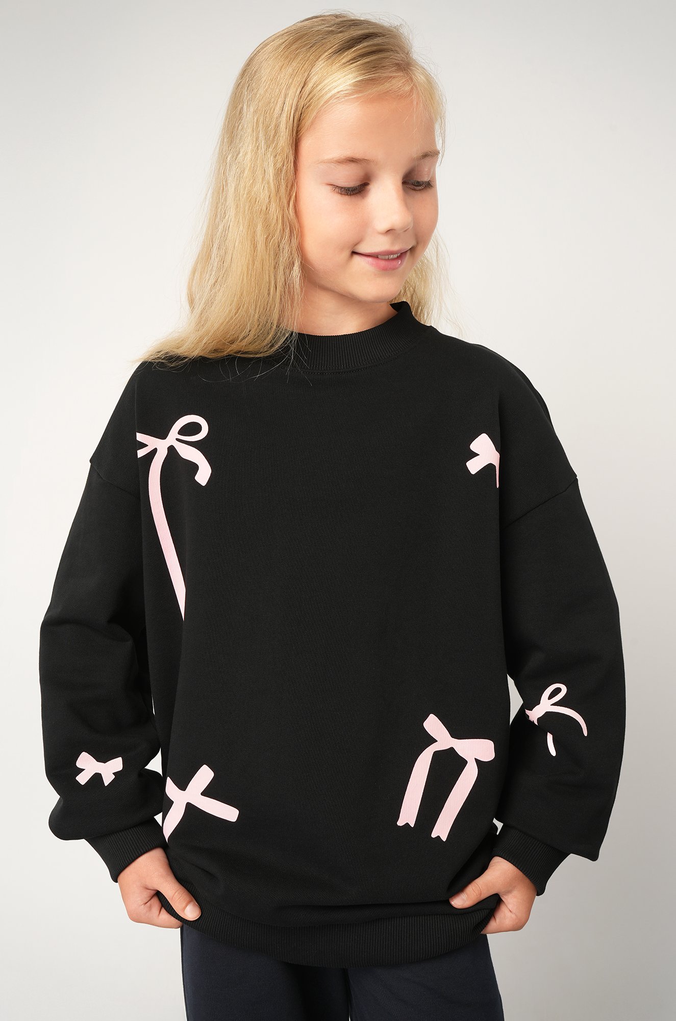 Черный свитшот с принтом бантики — тот самый вариант, который покорит сердце любой девочки! Теплый, стильный и удобный, он станет любимым в гардеробе. Базовый джемпер, который идеально подходит для подростка — прекрасный демисезонный вариант на осень и весну.Преимущества:– премиальный хлопковый трикотаж из футера трехнитки;– оверсайз силуэт, придающий образу легкость и непринужденность;– трикотажная ткань из 100% хлопка дарит комфорт и тепло (плотность 310 г/м2);– универсальность — уместен для школы и нарядных образов. Удлиненная толстовка с рисунком и спущенным плечом подчеркивает расслабленный стиль, а длинные рукава на манжетах добавляют уюта. Теплый подростковый джемпер для девочки отлично подойдет для детей, которые любят свободу и комфорт, а также для школьных будней или встреч с друзьями.