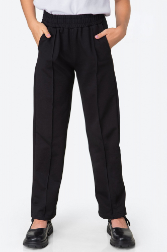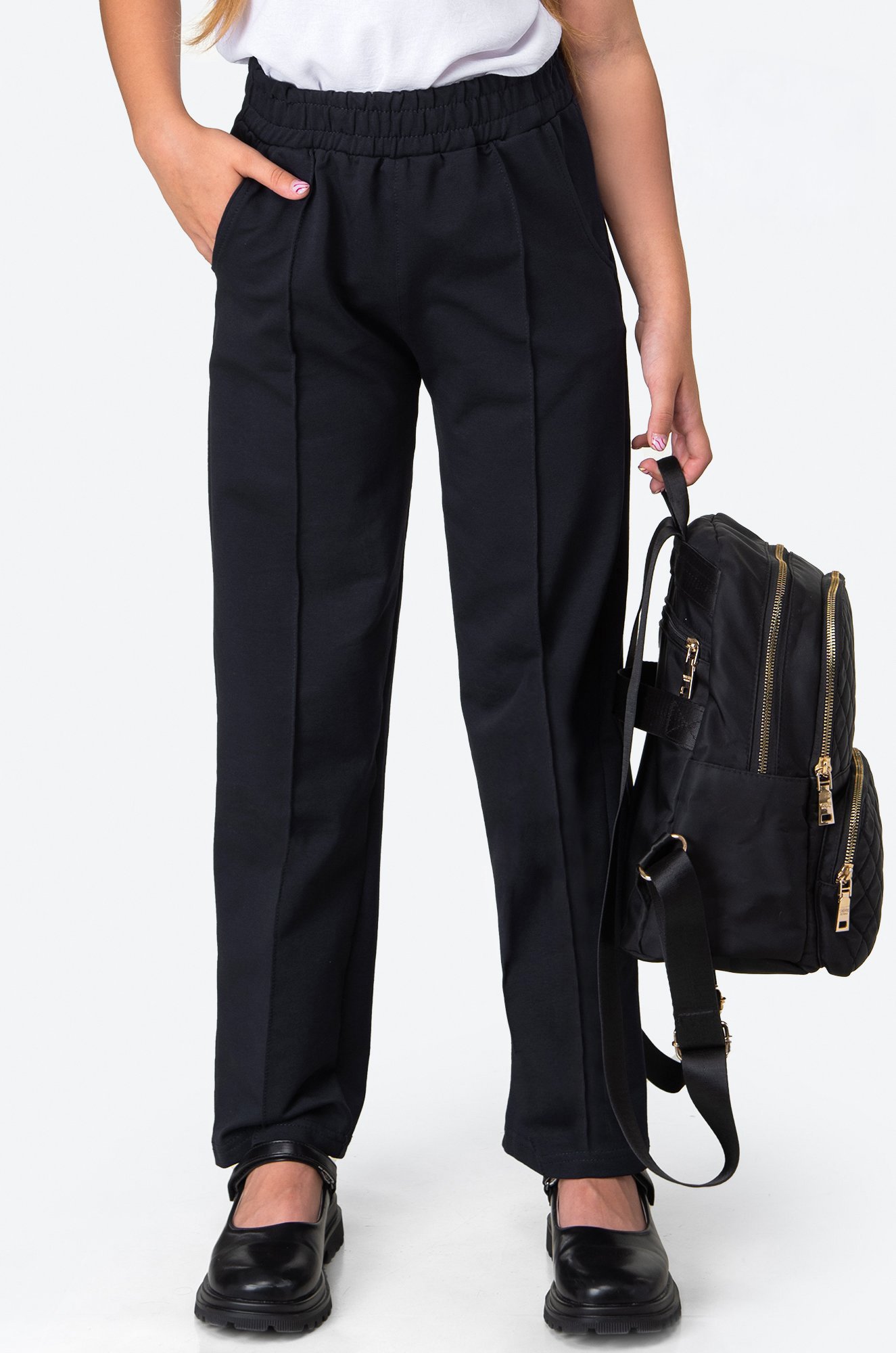 В школу – элегантной походкой! Однотон..показатьные трикотажные брюки для девочки и девочки-подростка выполнены из ткани футер петля темно-синего цвета. Детские брюки прямого кроя, высокая посадка, широкий пояс на эластичной резинке. Спереди отстрочены декоративные стрелки, по бокам предусмотрены карманы.
