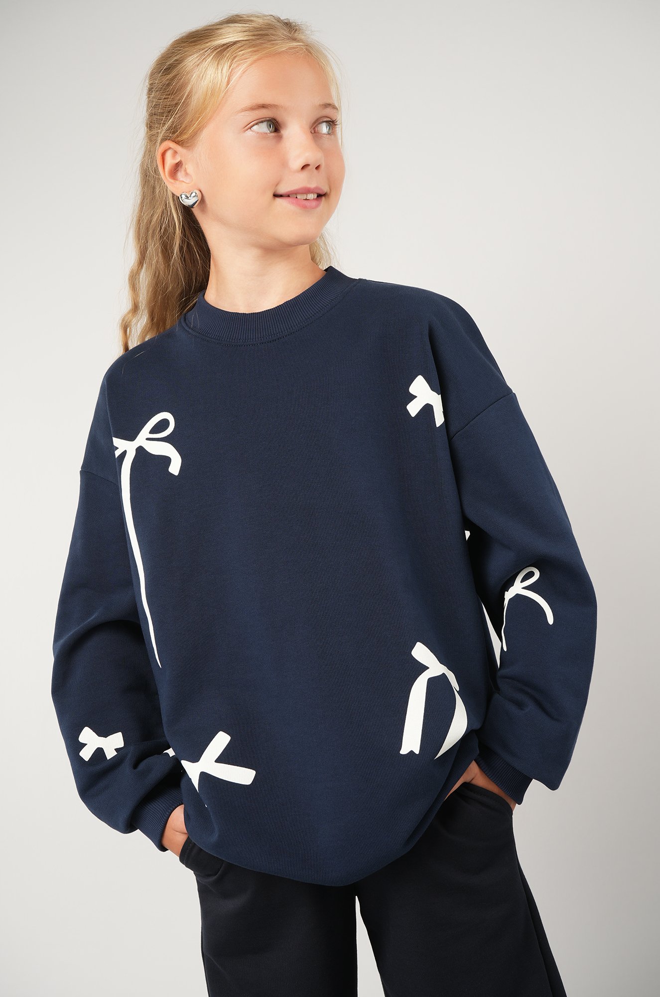 Синий свитшот с принтом бантики — тот ..показатьсамый вариант, который покорит сердце любой девочки! Теплый, стильный и удобный, он станет любимым в гардеробе. Базовый джемпер, который идеально подходит для подростка — прекрасный демисезонный вариант на осень и весну.