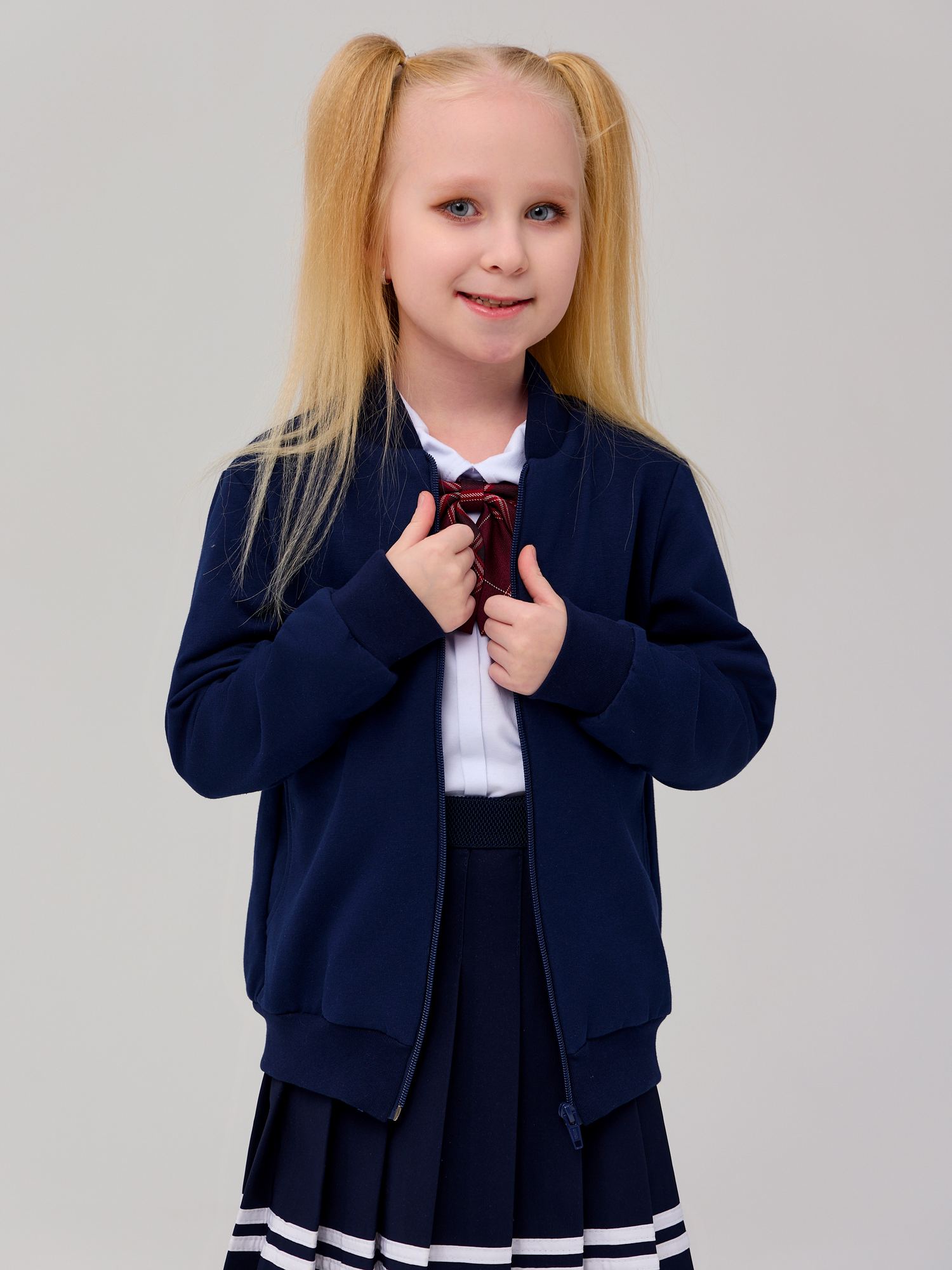 Стильный жакет-бомбер из футера(3х нитка) темно-синего цвета прямого силуэта с боковыми карманами и длинными рукавами, с застежкой-молнией. Воротник-стойка. Рукава на манжетах, низ изделия с планкой.
