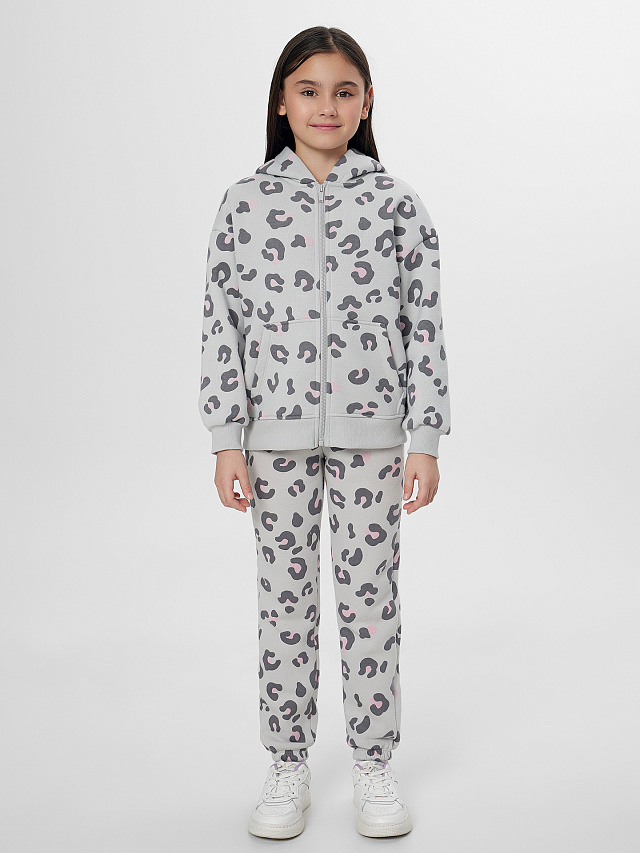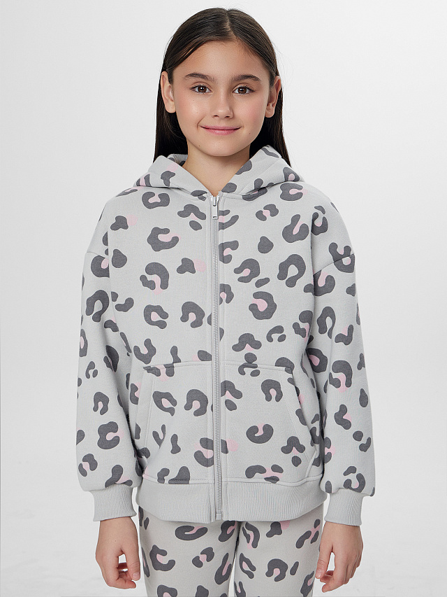 Серая толстовка на молнии с леопардовым принтом для девочек с мягким начесом внутри станет любимой вещью для прогулок и отдыха. Свободный крой и уютный капюшон дарят комфорт в течение всего дня. Удобная застежка-молния и практичный карман-кенгуру делают модель по-настоящему функциональной. Эластичные манжеты и пояс из рибаны бережно сохраняют тепло и обеспечивают идеальную посадку по фигуре.