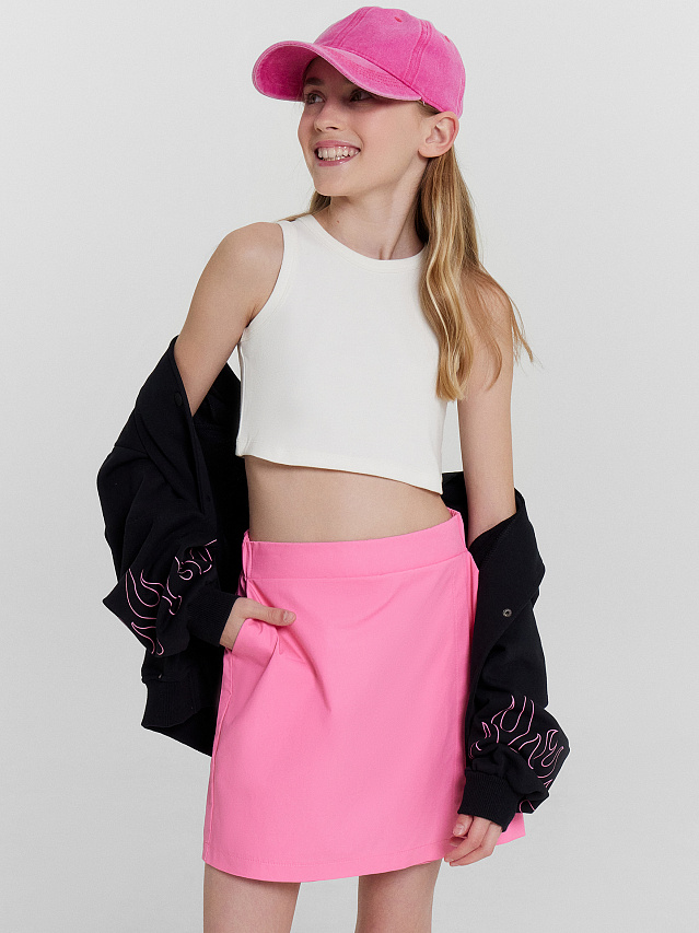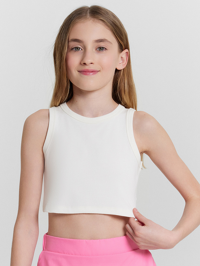 Топ для девочек прилегающего силуэта. Горловина круглая. Проймы и горловина окантованы бейкой из основного полотна. Низ изделия обработан швом в подгибку.