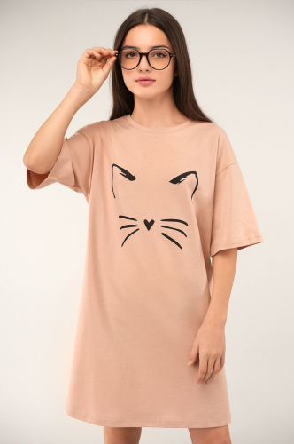 Домашняя туника оверсайз с принтом Котик сразу поднимает настроение. Хлопковый трикотаж делает её невероятно уютной.