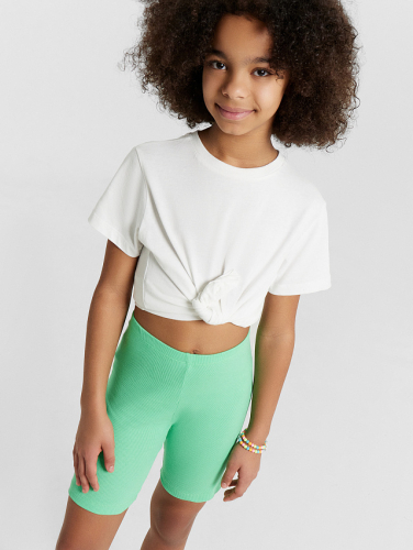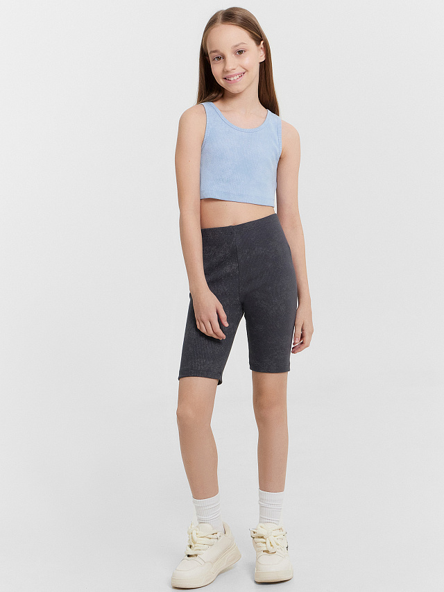 Велосипедки для девочек прилегающего силуэта. Пояс цельнокоеный, с эластичной тесьмой внутри 20RV. Длина до колена. Посадка высокая.