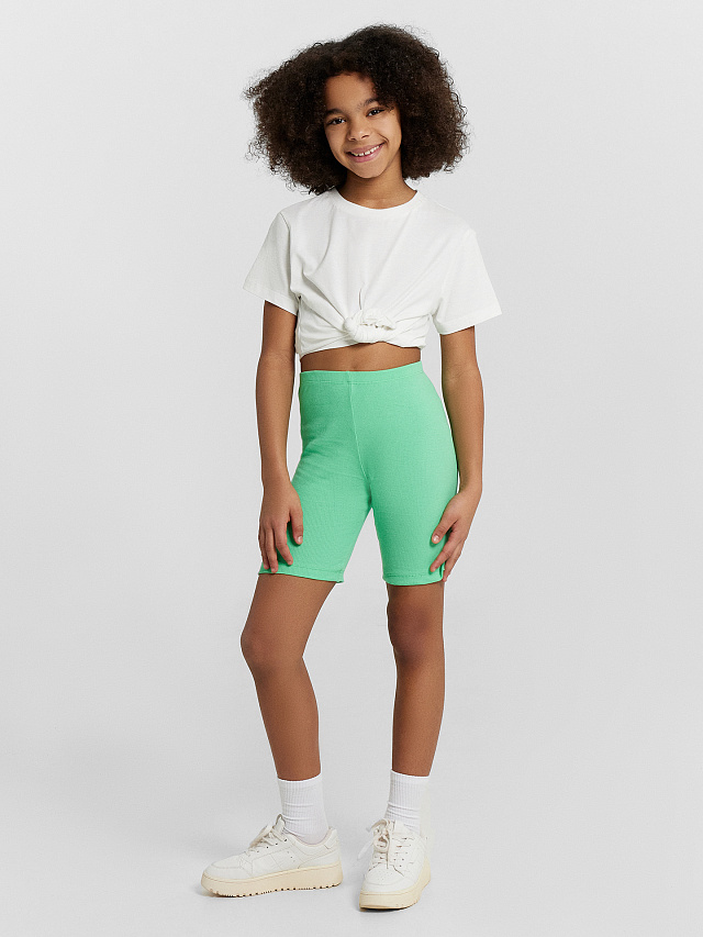 Велосипедки для девочек прилегающего силуэта. Пояс цельнокоеный, с эластичной тесьмой внутри 20RV. Длина до колена. Посадка высокая.