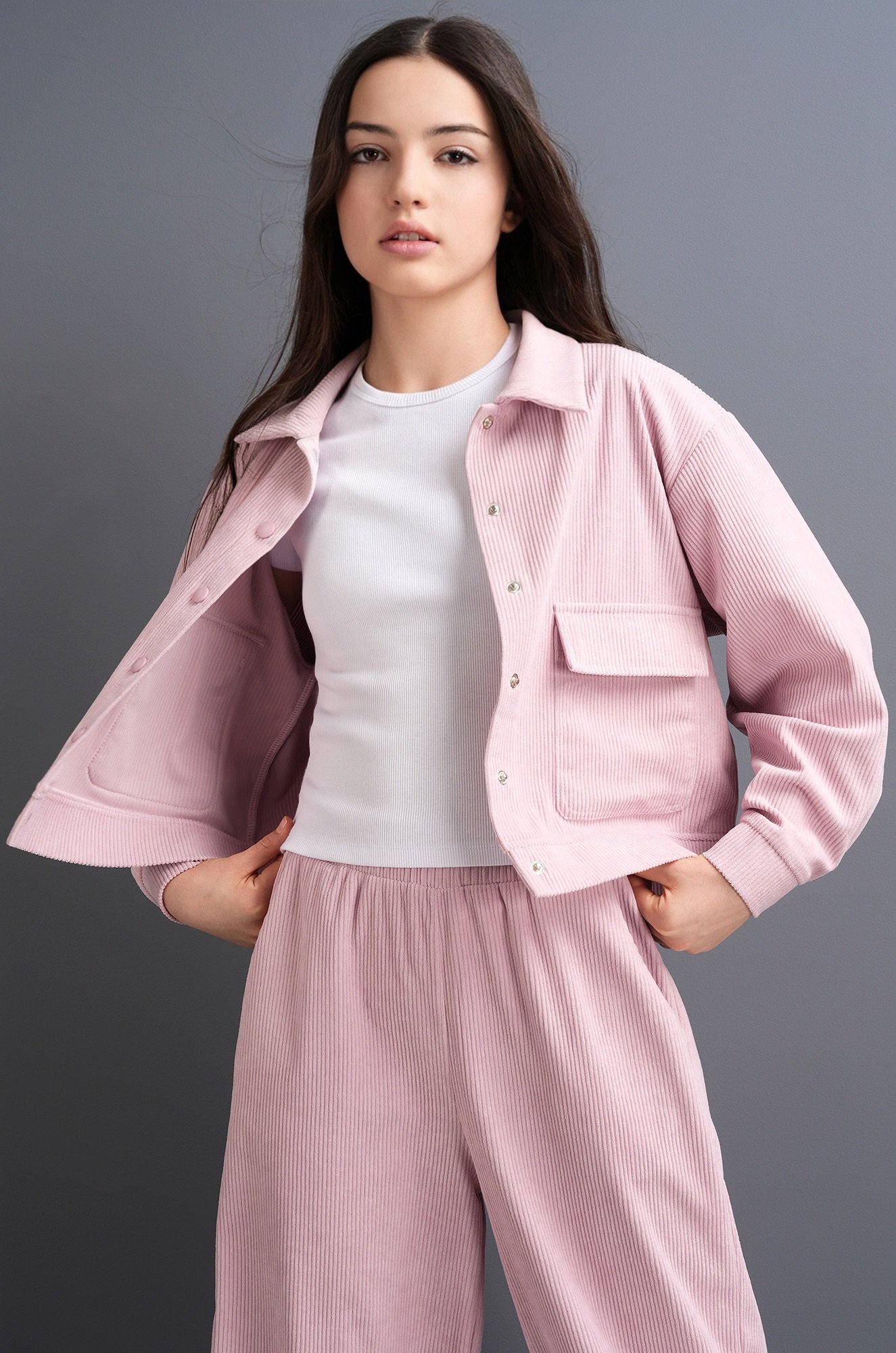 Вельветовый костюм с брюками для девочки — прекрасное решение на весну. Мягкая бархатная фактура и свободный крой делают подростковый костюм любимым вариантом на каждый день.