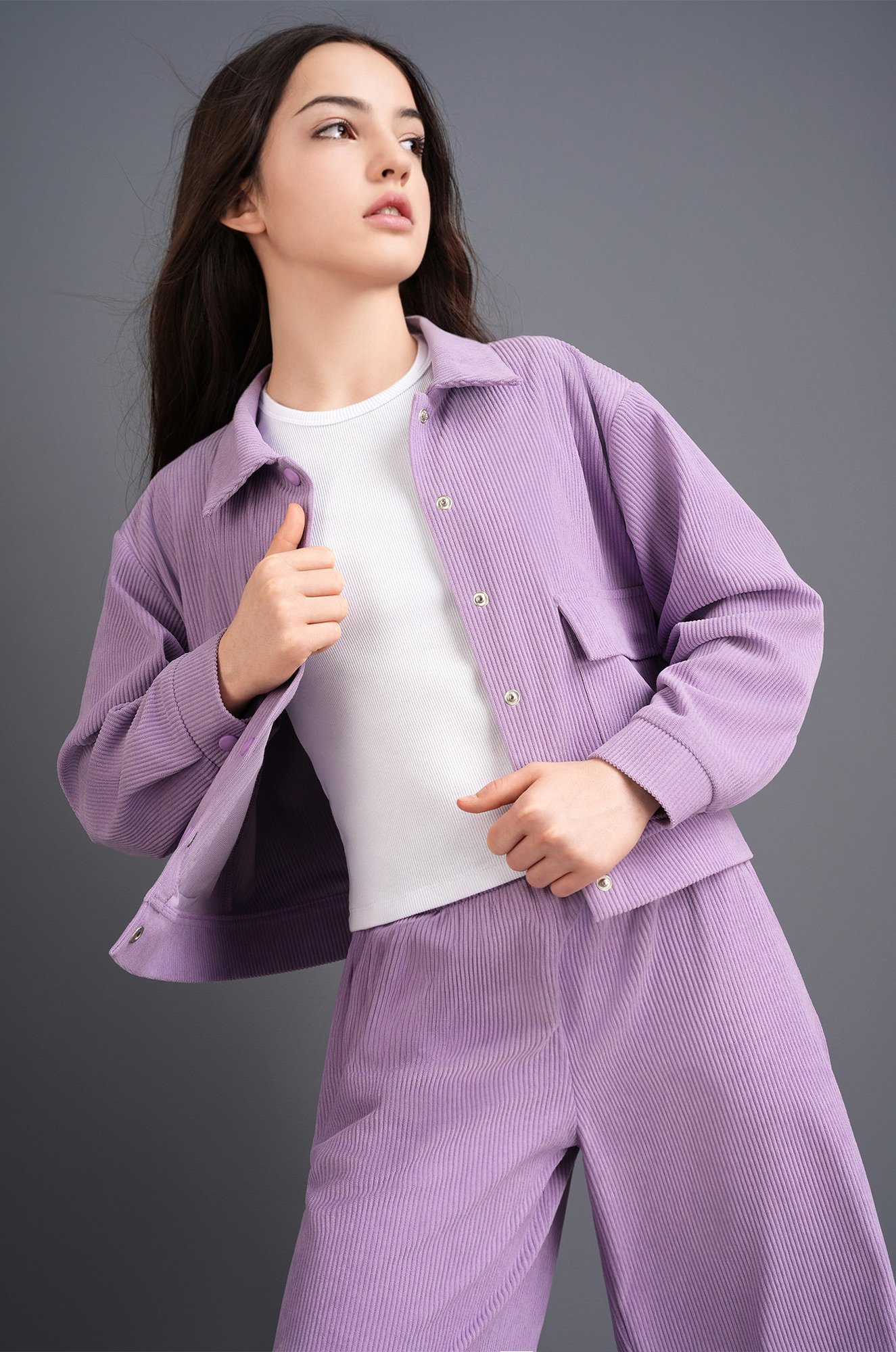— однотонный сиреневый цвет легко сочетается с другими элементами гардероба.