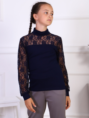 Детская блузка сшита  из легкого трикотажного полотна. Однотонный джемпер с отрезной кокеткой из гипюра, с длинными прозрачными рукавами, горловиной-стойкой, с манжетами.