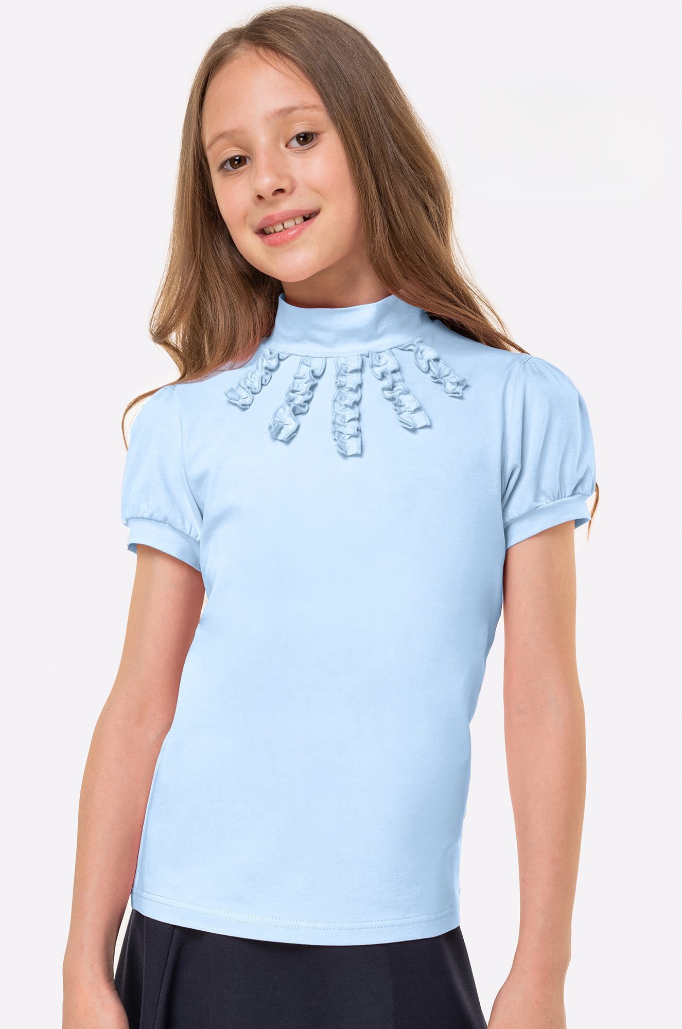 Индивидуальность в рамках школьных правил! Детская водолазка из мягкого и приятного к телу хлопка станет идеальным дополнением к школьной форме для девочки и девочек-подростков. Аккуратные рюши, короткие рукава-фонарики и базовый голубой цвет – важные детали, которые делают блузку для детей красивой и опрятной.