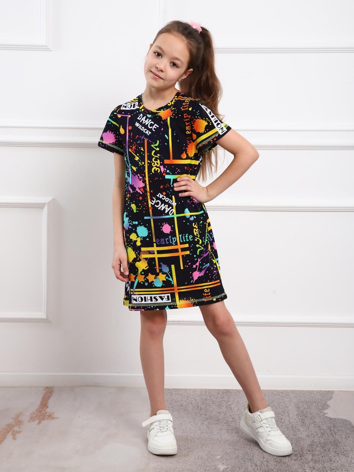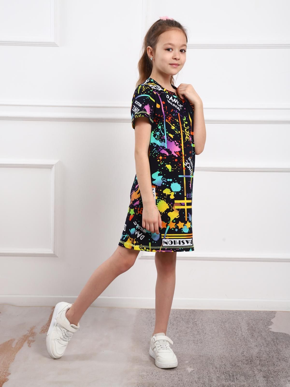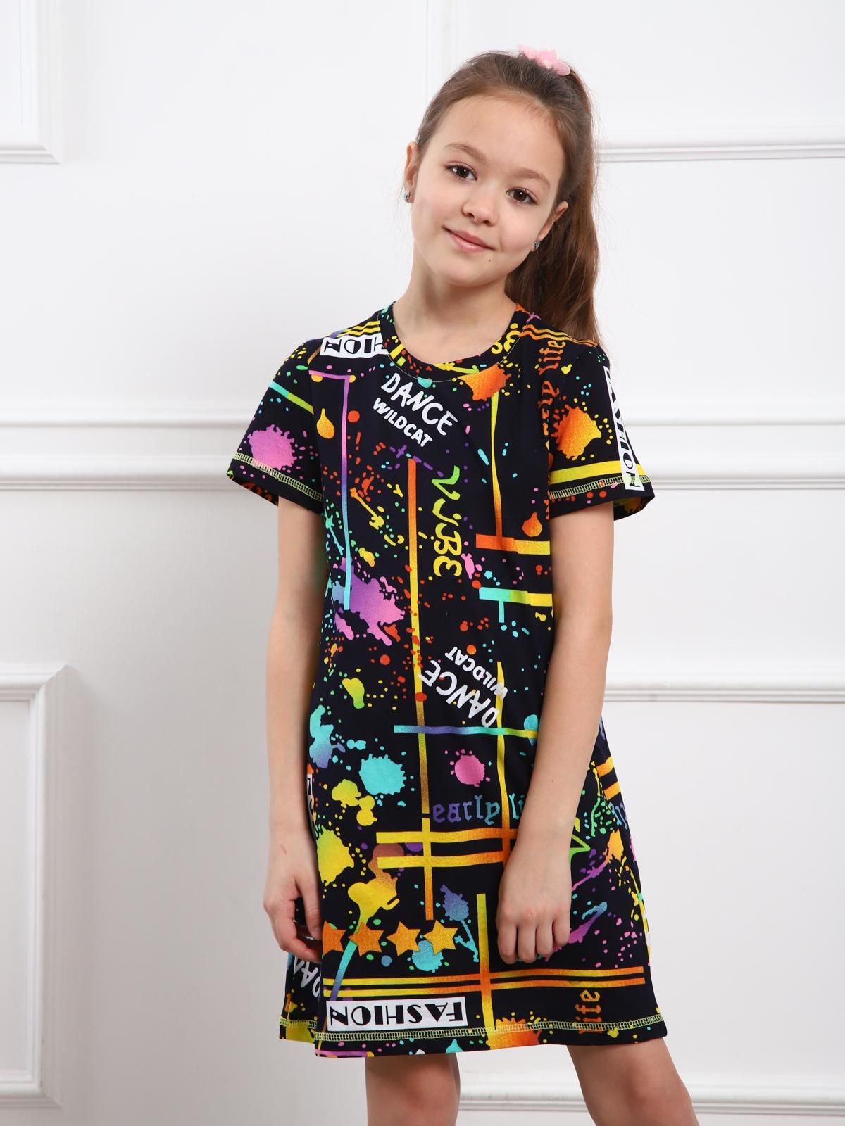 Базовая туника на девочку выполненная из хлопкового полотна пестрой расцветки. Изделие с коротким втачным рукавом и круглой горловиной.