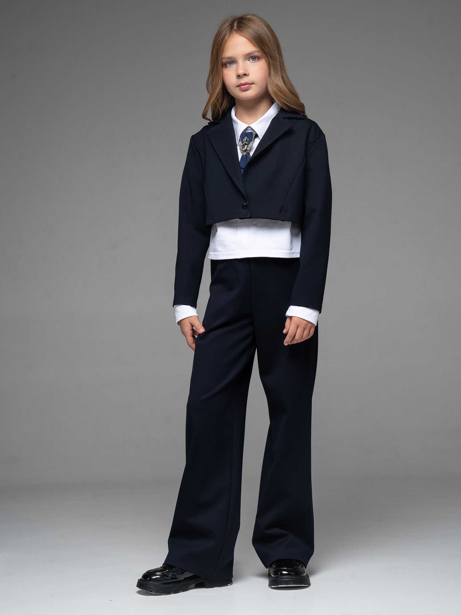"Школьные будни – не просто обязанность, но и возможность проявить стиль и индивидуальность. Идеальным дополнением школьного гардероба вашей малышки станет укороченный пиджак из джерси темно-синего цвета для девочки .