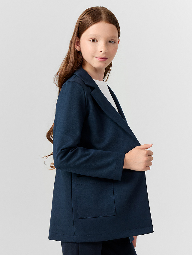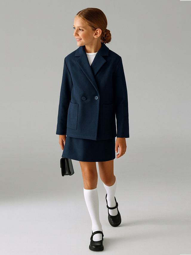 Базовый жакет для девочек выполнен в двубортном стиле с прямым силуэтом и длиной до линии бедер. Он имеет отложной воротник с лацканами, что придает образу строгость и элегантность. Центральная застежка оформлена петлями и пуговицами, создавая классический акцент на передней части изделия. Боковые накладные карманы добавляют функциональности и визуального интереса. Длинные рукава и низ жакета обработаны швом вподгибку, что обеспечивает аккуратный внешний вид и долговечность. Материал «академик» отличается плотностью и формоустойчивостью, благодаря чему жакет хорошо держит форму и подходит для прохладного времени года или официальных мероприятий.