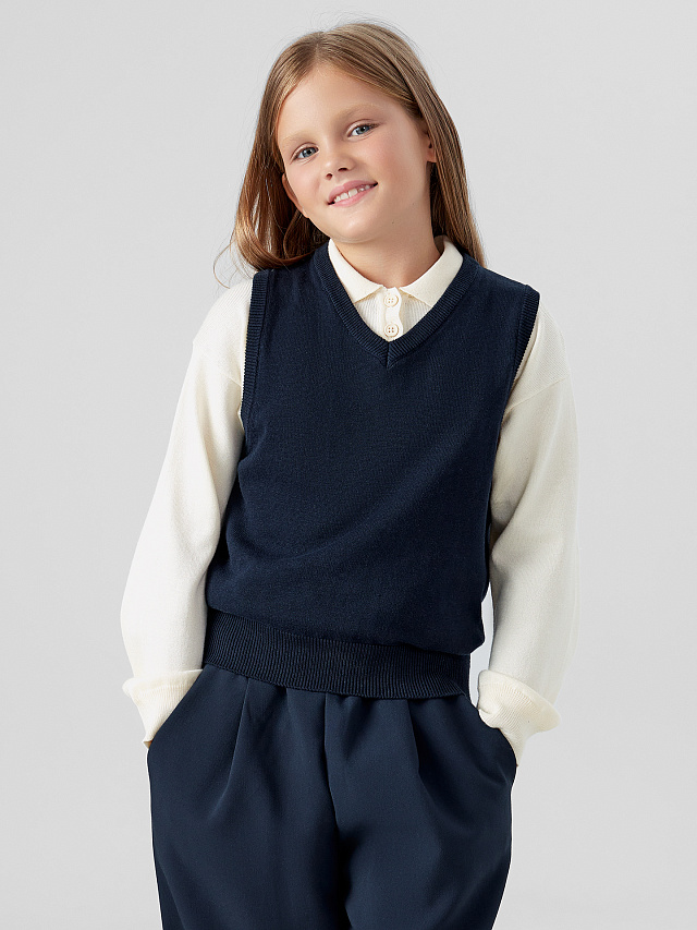 Универсальность модели позволяет сочетать её с блузками, рубашками, водолазками или платьями, создавая разнообразные стильные комплекты для повседневных занятий или торжественных мероприятий. Если вы хотите купить жилет для девочки, который объединяет функциональность, соответствие школьному дресс-коду и современный дизайн, эта модель станет идеальным выбором. Синий школьный жилет для девочки— это инвестиция в стиль и уверенность вашего ребенка, подчеркивающая опрятность и индивидуальность.
