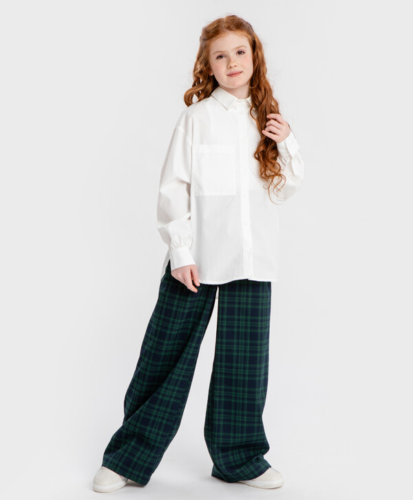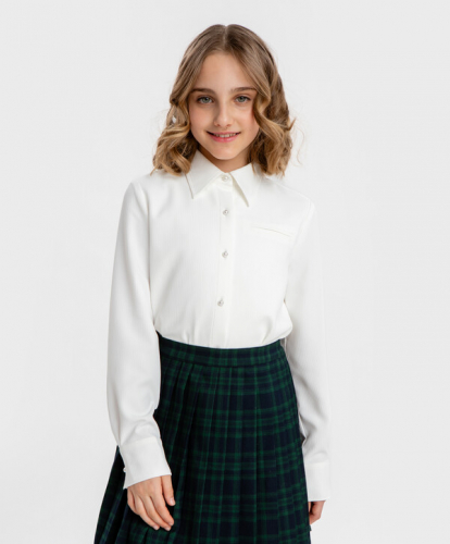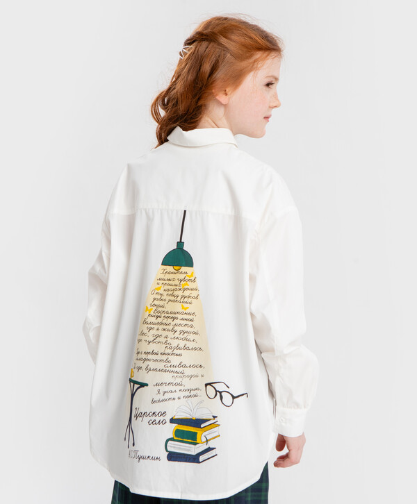 Школьная молочная рубашка с длинными рукавами для девочки. Эта модель от Button Blue сделана из хлопка, поэтому приятная к телу, хорошо пропускает воздух, не требует особенного ухода. Изделие средней плотности - практически не просвечивается. Блуза прямого силуэта со спущенной линией плеча не облегает и не сковывает движения. Ее удобно носить как заправленную, так и навыпуск. Широкие манжеты застегиваются на пуговицу, а сами рукава образуют небольшую сборку, немного напоминая фонарики. Спереди расположен накладной карман. Модель выполнена с отложным воротником, что делает образы более собранными и сдержанными. Застегивается рубашка на пуговицы. Все эти мелочи добавляют образу элегантности, поэтому блузка идеально впишется как в школьные луки, так и будет уместна на празднике или в повседневной жизни. Ее можно носить самостоятельно или надевать под жакеты, джемперы, пуловеры и кардиганы. А за счет того, что спинка блузы чуть удлиненная, можно заправить только переднюю часть изделия для составления трендового образа. Модности этой рубашке добавляет крупный водный принт на спине - стихотворение Пушкина и изображения на тему литературы. Следуйте рекомендациям по уходу, указанным на вшивной этикетке.